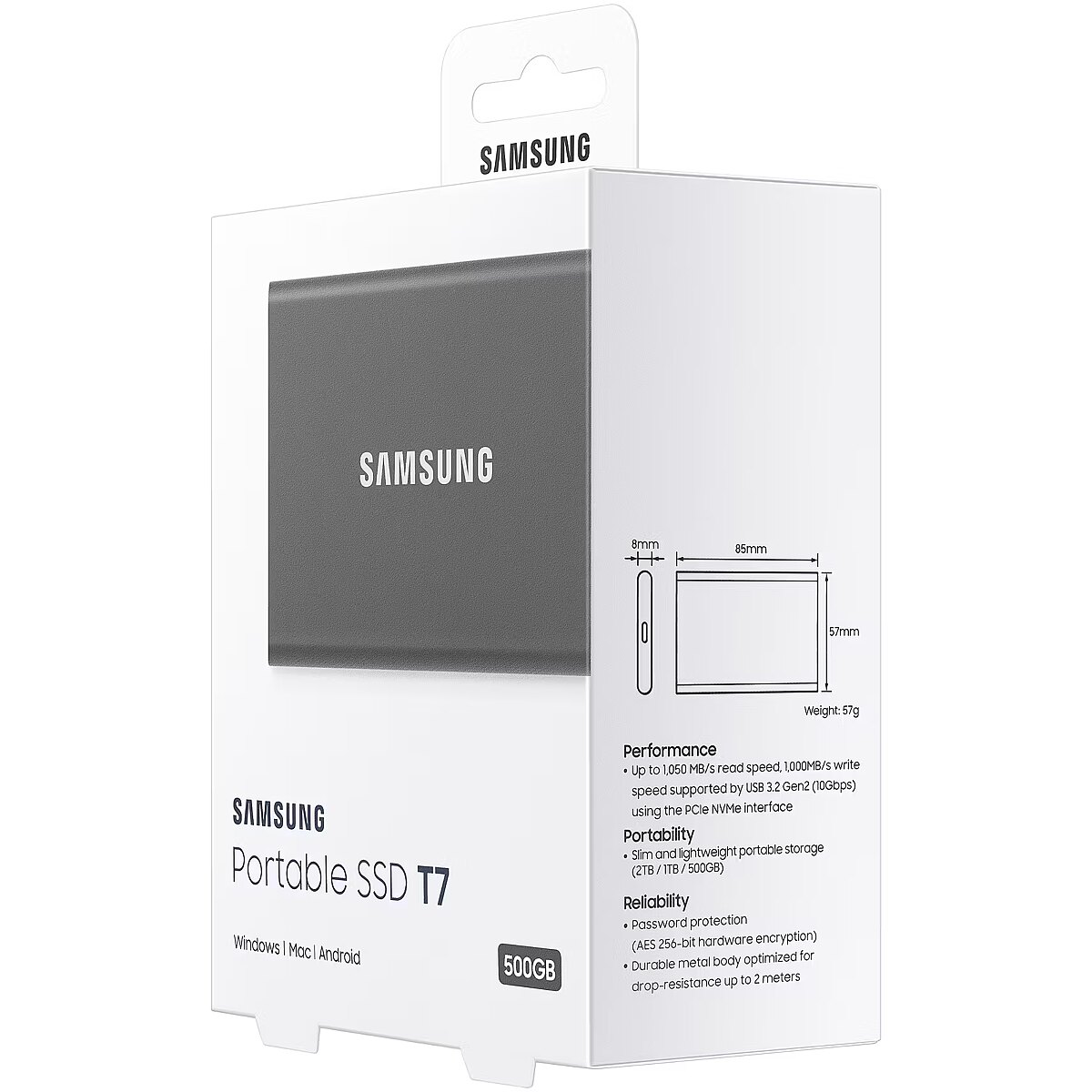 LongSummaryDescription - Samsung Portable SSD T7. SSD capacity: 500 GB. USB connector: USB Type-C, USB version: 3.2 Gen 2 (3.1 Gen 2). Read speed: 1000 MB/s, Write speed: 1000 MB/s. Password protection. Product colour: Grey