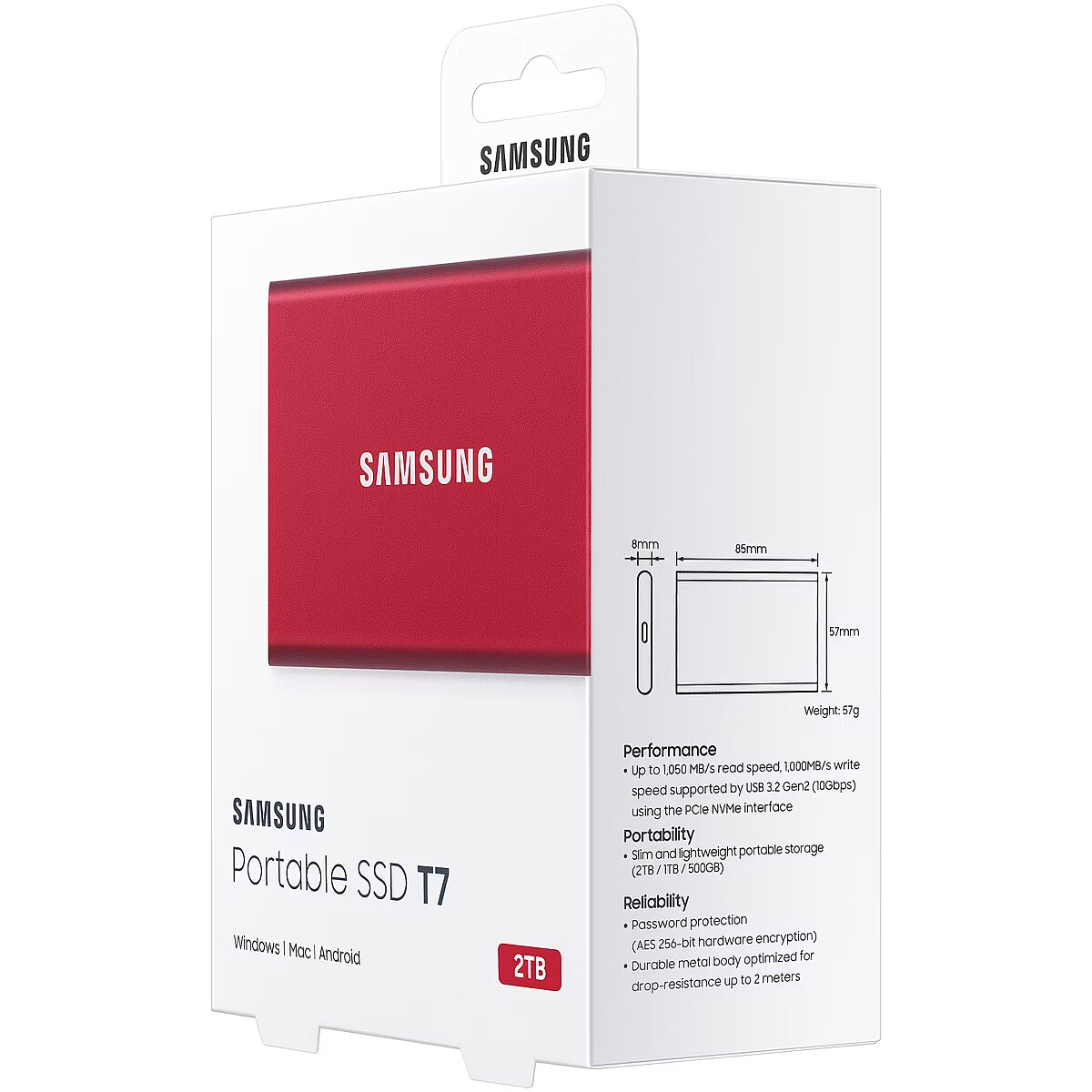 LongSummaryDescription - Samsung Portable SSD T7. SSD capacity: 2 TB. USB connector: USB Type-C, USB version: 3.2 Gen 2 (3.1 Gen 2). Read speed: 1050 MB/s, Write speed: 1000 MB/s. Password protection. Product colour: Red