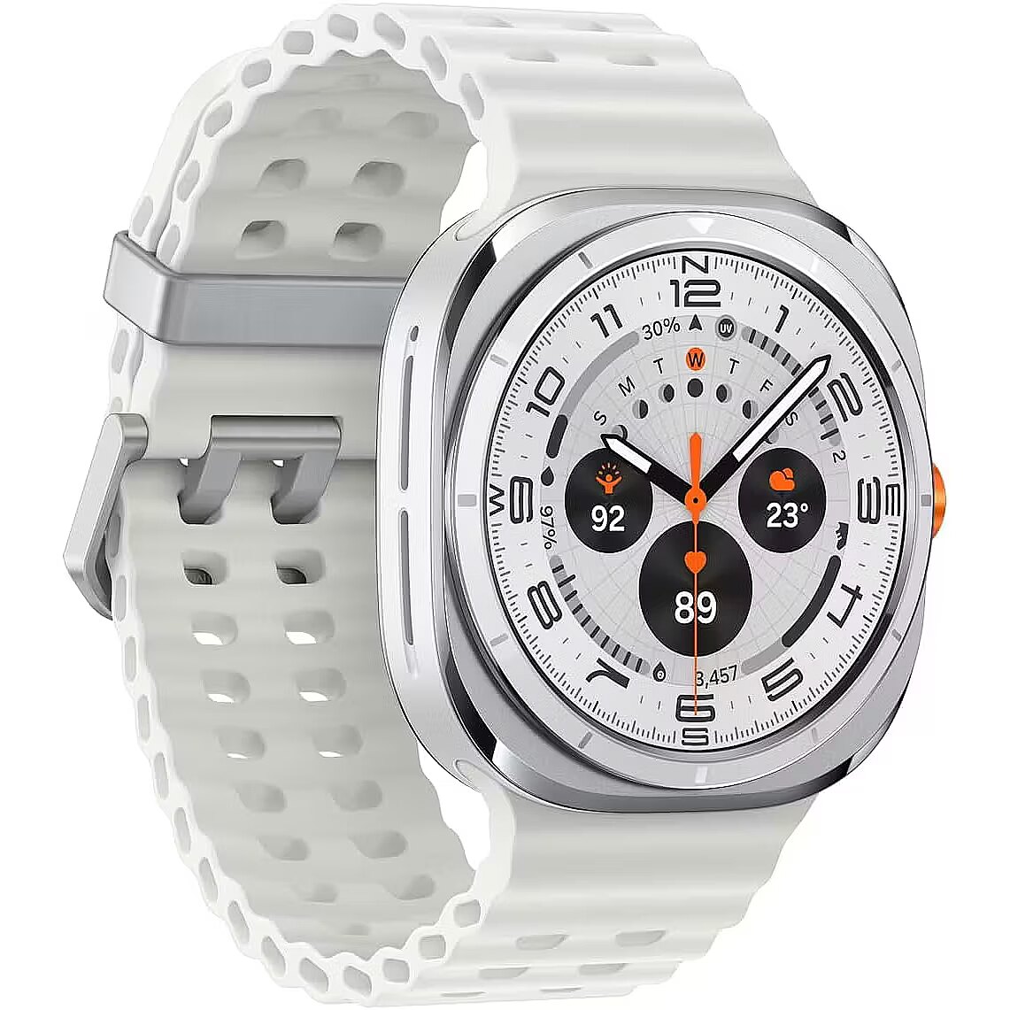 LongSummaryDescription - Samsung Galaxy Watch Ultra. Display diagonal: 3.81 cm (1.5"), Display technology: AMOLED, Display resolution: 480 x 480 pixels, Touchscreen. RAM capacity: 2000 MB, Flash memory: 64 GB. Wi-Fi. GPS (satellite). Battery capacity: 590 mAh. Weight: 60.5 g. Band colour: White. Operating system installed: Wear OS
