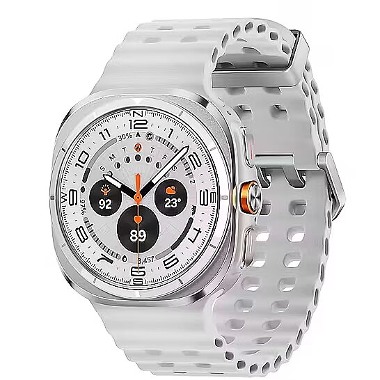 LongDesc - The toughest Galaxy Watch everImpact-ready cushion designTitanium shades. New in Blue.Galaxy Watch Ultra is available in Titanium Gray, Titanium Silver, Titanium White and now Titanium Blue. With performance bands to match, each finish makes a statement in the spirit of adventure.High-endurance battery powerOur longest-lasting Watch battery ever plus new power saving modes keep your health monitoring on-track for days even if you go off-grid.Bands for anything. One UI for everything.Gear up for every expedition with a range of band options for all terrains. With the new One UI 8 Watch, powered by an all-new processor, Galaxy Watch Ultra has you covered wherever you roam. At a glance in any lightWhen dark falls, Night mode keeps your info visible without straining your eyes. Perfect for preserving the beauty of the night sky when you're deep in the wild. Galaxy AIGalaxy AI iconKnow your score.Own your day.Start your day strong with a score that calculates your physical readiness based on yesterday's activity. Energy Score Galaxy AI analyzes key indicators of your overall condition and gives you a daily score so you can crush your goals. Power up cycling with Functional Threshold PowerWith a power meter paired with your Galaxy smartphone, Galaxy AI quickly estimates your Functional Threshold Power based on your own heart rate. Set your training intensity according to your FTP and hit your peak performance. Track heart stress while you sleepVascular Load monitoring shows you when there’s an increase in your stress level and the factors that affect it, like diet and sleep. Plus, it offers get targeted suggestions to improve and help protect against heart disease. Nourish and flourish with AGEs indexFor the first time on Galaxy Watch, see how your diet could affect your metabolic health with the new Advanced Glycation End-products (AGES) index. Monitor your meal choices, improve your lifestyle and maintain peak performance. In perfect sync with your phoneGalaxy Watch Ultra connects seamlessly with your Galaxy devices and comes LTE-enabled so you can leave your phone at home.Raise. Speak. Solved.Stay one step ahead of your day with a watch that helps navigate tasks and to-do lists. Need to send a text while on a run? Raise your wrist and speak your command and your Watch does the rest for you. Watch pairs with your Android smartphoneGalaxy Watch works seamlessly with Samsung phones and also works with other Android phones.Download the Galaxy Wearable and Samsung Health apps to get started using Galaxy Watch with your device.