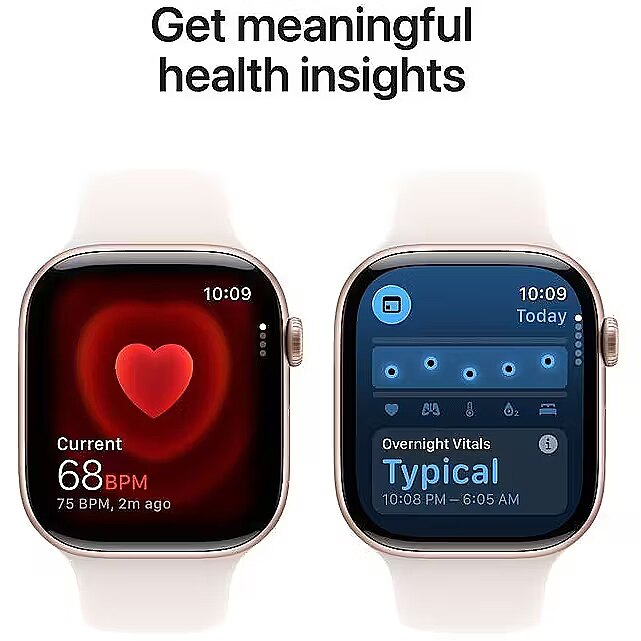 Hypertension, or high blood pressure, impacts over 1.3 billion adults worldwide and is a leading cause of a heart attack, stroke, and kidney disease. The condition frequently goes undiagnosed because it often has no symptoms — and even during a doctor’s visit, with a single measurement it can be easily missed. Receive hypertension notifications just by wearing your watch. Series 11 can notify you if it identifies patterns of hypertension. How? The optical sensor provides data to an algorithm that can detect potential hypertension by analyzing how your blood vessels respond to beats of the heart over 30-day periods. Groundbreaking insights. Grounded in science. We developed hypertension notifications using advanced machine learning methods and a series of studies totaling over 100,000 participants. The feature was then validated in a clinical study. Set up a blood pressure log. If you receive a hypertension notification and have access to a blood pressure cuff, you can track your blood pressure in the Health app on iPhone to create a report that will lead to more meaningful conversations with your healthcare provider. More features to empower your health. Wake up to your sleep score. Sleep quality is influenced by factors such as sleep duration, bedtime consistency, how often you wake up, and time spent in each sleep stage. Sleep score analyzes these factors every night and provides a classification and a score. You’ll see how the score is calculated, so you can understand the quality of your sleep and learn how to make it more restorative. Wake up to your sleep score. Sleep quality is influenced by factors such as sleep duration, bedtime consistency, how often you wake up, and time spent in each sleep stage. Sleep score analyzes these factors every night and provides a classification and a score. You’ll see how the score is calculated, so you can understand the quality of your sleep and learn how to make it more restorative. The Vitals app. Your daily health status, stat. Quickly see your overnight health data — including heart rate, respiratory rate, wrist temperature, and sleep duration — and get notified if multiple metrics are ever outside your typical range. Follow your heart on the ECG app. With Series 11 you can check for signs of atrial fibrillation, or AFib, right from your wrist by using the ECG app to generate a single-lead electrocardiogram. Stay on the pulse with the Heart Rate app. You can check your heart rate at any time — and get automatic notifications for a high or low heart rate or an irregular rhythm. Cycle Tracking keeps you in the loop. Since cycles vary, the best way to understand what’s normal for you is by tracking your menstrual cycle. You can use Cycle Tracking to log your period, record symptoms, and get predictions about your next period or fertile window. It can also notify you if a cycle deviation is detected. Get retrospective ovulation estimates. Series 11 has advanced sensors that track your wrist temperature while you sleep. The Cycle Tracking app uses this data to provide a retrospective estimate of when you likely ovulated, which can be helpful for family planning. Measure your blood oxygen. It’s a breathtaking innovation. The Health app on iPhone uses data from the sensor in Apple Watch to enable you to take on-demand readings of your blood oxygen as well as background readings, day and night. Fitness Better by every measure.
