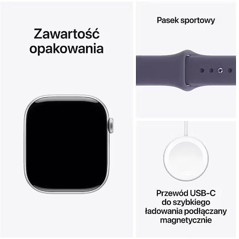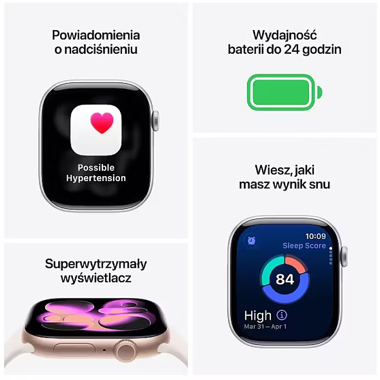 Im więcej wiesz o swoim zdrowiu, tym skuteczniej możesz się o nie zatroszczyć. Z Apple Watch Series 11 masz jego pełniejszy obraz. Dzięki apkom takim jak EKG i Parametry życiowe możesz na bieżąco monitorować swój stan. A przełomowa funkcja Powiadomienia o nadciśnieniu to nieocenione wsparcie w profilaktyce zdrowego serca. Powiadomienia o nadciśnieniu Nadciśnienie dotyka ponad 1,3 miliarda osób na całym świecie i stanowi główną przyczynę zawału serca, udaru czy chorób nerek. Nie daje objawów, więc często nie zostaje zdiagnozowane. Bywa przeoczone nawet podczas wizyty lekarskiej, ponieważ w jej trakcie dokonuje się zwykle tylko jednego pomiaru ciśnienia. Aby otrzymywać powiadomienia o nadciśnieniu, wystarczy nosić zegarek przez minimum 30 dni. Series 11 da Ci znać, jeśli zauważy symptomy możliwego nadciśnienia. Jak to działa? Czujnik optyczny gromadzi dane, które następnie analizowane są przez algorytm pod kątem ewentualnego nadciśnienia. W tym celu sprawdza się reakcje naczyń krwionośnych na bicie serca przez okres 30 dni. Zupełnie nowe spojrzenie. Twarde naukowe podstawy. Powiadomienia o nadciśnieniu to przełomowa funkcja, która została stworzona w oparciu o zaawansowane metody uczenia maszynowego oraz serię badań naukowych. Wzięło w nich udział ponad 100 000 osób. Ostatnim krokiem było sprawdzenie funkcji podczas badań klinicznych. Twój dziennik pomiarów ciśnienia tętniczego. Po otrzymaniu powiadomienia o nadciśnieniu możesz zacząć prowadzić dziennik pomiarów w aplikacji Zdrowie na iPhonie. Będziesz potrzebować do tego ciśnieniomierza. Twój dziennik ułatwi komunikację z lekarzem prowadzącym. Więcej funkcji wspierających zdrowie Sprawdź jakość snu na dzień dobry. Wpływają na nią takie czynniki jak długość snu, regularne zasypianie, liczba przebudzeń i czas przypadający na każdą fazę snu. Funkcja Wynik snu każdej nocy analizuje te czynniki, a rano przedstawia podsumowanie w formie czytelnego raportu. W ten sposób dowiesz się, co dokładnie wpływa na jakość Twojego snu, oraz jak sprawić, żeby był bardziej regenerujący. Nie przymykaj oka na bezdech senny. Polega on na powtarzających się epizodach zatrzymania oddychania podczas snu. Nieleczony bezdech senny może zwiększyć ryzyko nadciśnienia, cukrzycy typu 2, chorób serca oraz innych problemów zdrowotnych. Series 11 monitoruje zaburzenia oddychania podczas snu i powiadamia o możliwym bezdechu sennym. Apka Parametry życiowe. Wgląd w Twój codzienny stan zdrowia na cito. Szybko sprawdzisz w niej dane zarejestrowane w nocy, w tym tętno, częstość oddechów, temperaturę nadgarstka, natlenienie krwi czy długość snu. Dostaniesz też powiadomienie, jeśli wartości będą odbiegały od normy. Aplikacja EKG. Serce na dłoni. Apka EKG w Series 11 pozwala wykryć objawy migotania przedsionków oraz oznaki nieregularnego rytmu serca. Pomiary wykonywane są prosto z nadgarstka na podobnej zasadzie jak w elektrokardiografie jednoodprowadzeniowym. Z aplikacją Tętno trzymasz rękę na pulsie. Sprawdzisz go w dowolnej chwili. Otrzymasz również powiadomienia, gdy tętno będzie zbyt wysokie lub zbyt niskie, a także w przypadku wystąpienia arytmii. Śledzenie cyklu pozwoli Ci być na bieżąco. Każdy cykl menstruacyjny jest inny. Obserwując swój, dobrze poznasz jego rytm. Funkcja Śledzenie cyklu pozwoli Ci zapisywać przebieg miesiączki i towarzyszących jej objawów. Otrzymasz przewidywaną datę kolejnego okresu oraz dni płodnych. Funkcja powiadomi Cię również w razie nietypowego przebiegu cyklu. Szacunkowy czas owulacji na podstawie wcześniejszych danych. Series 11 ma zaawansowany czujnik, który monitoruje Twoją temperaturę w czasie snu. Apka Śledzenie cyklu na podstawie tych danych wyznaczy prawdopodobny czas owulacji. Informacje te są niezwykle pomocne w planowaniu rodziny. Pomiar natlenienia krwi. Zapierająca dech innowacja. Apple Watch Series 11 wyposażono w czujnik i apkę, które mierzą natlenienie krwi zarówno wtedy, gdy chcesz to sprawdzić, jak i w tle. Dniem i nocą. Kto zna wyniki, ten ma wyniki Niezależnie od tego, czy chcesz poprawić swoje wyniki na bieżni czy na basenie, Apple Watch Series 11 pomoże Ci w treningu na niezliczone sposoby. Urządzenie mierzy każdy Twój ruch, analizując wiele przydatnych parametrów. Bo gdy wiesz więcej, osiągasz więcej. Brzmi sprytnie? No to zaczynamy! Rozpocznij trening jednym kliknięciem. Odświeżona apka Trening. Zaskakuje formą. W jej udoskonalonym interfejsie znajdziesz umieszczone w rogu cztery nowe przyciski. Zapewniają szybszy dostęp do takich funkcji jak: Tempo bazowe, Wyścig na trasie i Trening własny. Rób kolejne okrążenia Pierścieni aktywności. W ruchu, Ćwiczenie, Na nogach. W apce Aktywność animacja domykania pierścieni odwzorowuje to, jak się poruszasz. Możesz także wstrzymywać pierścienie i dostosowywać swoje cele na każdy dzień tygodnia. Wspiera biegaczy na każdym poziomie Niezależnie od tego, jakie są Twoje biegowe cele, dzięki zaawansowanym funkcjom Apple Watch osiągniesz je z łatwością. Wytrzymała bateria, precyzyjny GPS i motywujące funkcje, które pozwalają na bieżąco śledzić treningi, zapewnią Ci idealny start. Czas na Twoją nową życiówkę. Obciążenie treningowe sprawdzisz lekką ręką. Dzięki pomocnym analizom masz lepszy wgląd w to, jak intensywność treningów wpływa na Twoje ciało. Będziesz wiedzieć, kiedy dokręcić śrubę, a kiedy odpocząć. Stwórz swój własny trening. Dopasuj ćwiczenia do własnych potrzeb na Apple Watch albo iPhonie. Możesz modyfikować cele, np. czas aktywności, dystans czy liczbę spalanych kalorii. Otrzymasz także alerty dotyczące tempa, tętna, kadencji i mocy. Twoje dane treningowe na iPhonie. Pomiary wykonane przez Series 11 podczas treningu znajdziesz w aplikacji Fitness na iPhonie. Prześledzisz tam swoje postępy i ukończone treningi, zmo