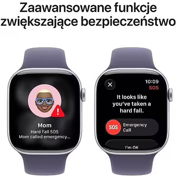 Jeszcze dłuższa praca baterii? Mamy to. Bateria Apple Watch Series 11 wystarcza nawet na 24 godziny normalnej pracy. Ogromny skok wydajności sprawia, że po całym dniu nie musisz zdejmować zegarka na noc, żeby go naładować. Dzięki temu masz lepszą wiedzę na temat swojego zdrowia. Sieć komórkowa to pełna swoboda Dzwoń i tekstuj. Series 11 obsługuje sieć komórkową. Z planem taryfowem jesteś w kontakcie niemal wszędzie, nawet jeśli na czas biegania Twój iPhone został w domu. Apple Watch Series 11 z kopertą z tytanu w kolorze naturalnym, pleciona opaska Solo w kolorze szarozielonym, połączenie przychodzące, widać zdjęcie osoby dzwoniącej, przyciski akceptacji lub odrzucenia połączenia, widać prawy bok urządzenia i pokrętło Digital Crown Zrobisz wszystko skinieniem. Szybkim obrotem nadgarstka wyciszysz przychodzące połączenie, wyłączysz minutnik, odrzucisz powiadomienie i nie tylko. Poręczne rozwiązanie, gdy masz zajęte ręce. Apple Pay. Pieniądze masz dosłownie pod ręką. Małe zakupy w biegu? Jednym stuknięciem w Apple Watch zapłacisz niemal za wszystko w miejscach oznaczonych symbolem płatności zbliżeniowych. Szybko i łatwo. Znajdź swojego iPhonea. Jeśli Twój iPhone gdzieś się zawieruszył, funkcja Znajdowanie dokładne wskaże Ci odległość od niego i kierunek. Kiedy zbliżysz się do urządzenia, dotykowe sygnały zwrotne i dźwiękowe oraz graficzny wskaźnik pomogą je zlokalizować. Stos inteligentny daje wskazówki. Sztos. Udoskonalone algorytmy predykcyjne wyciągają wnioski z danych gromadzonych na urządzeniu oraz analizy Twoich codziennych nawyków. Dzięki temu Stos inteligentny może dyskretnie zasugerować to, co w danej chwili przyda Ci się najbardziej. O, spójrz! Czas pobiegać. Bonjour. Tu Tłumaczenie na żywo. Dzięki Apple Intelligence na Twoim iPhonie aplikacja Wiadomości automatycznie tłumaczy tekst na wybrany język. No i to rozumiem. Funkcja dostępna w wybranych językach. Jego supermoc? Wzywa pomoc. Apple Watch Series 11 jest pełen innowacyjnych rozwiązań stworzonych z myślą o Twoim bezpieczeństwie. Zaprojektowaliśmy go tak, żeby wezwał pomoc, gdy jej najbardziej potrzebujesz. Nawet gdy nie masz przy sobie iPhone'a. Alarmowe SOS. ASAP. Pilnie potrzebujesz pomocy? Jeśli naciśniesz i przytrzymasz przycisk boczny, Apple Watch Series 11 postara się wezwać służby ratunkowe i udostępnić im Twoje położenie. Funkcja Wykrywanie upadków w pogotowiu. Apple Watch Series 11 wykrywa niebezpieczne upadki i pomaga wezwać służby ratunkowe. Ponadto przekazuje dyspozytorom informacje o Twojej lokalizacji i powiadamia bliskich. Chroni Cię funkcja Wykrywanie wypadków. Gdziekolwiek jesteś. W razie poważnego zderzenia samochodowego Series 11 automatycznie pomoże wezwać służby ratunkowe i powiadomi Twoje kontakty alarmowe. Wychodzisz? Zamelduj się. Dzięki funkcji Daj znać zegarek automatycznie powiadomi wybrane przez Ciebie osoby o dotarciu do celu. A jeśli idziesz pobiegać po zmroku, sesję Daj znać możesz uruchomić na czas treningu, żeby poinformować bliskich o jego zakończeniu. Z funkcją Ślad wrócisz na właściwe tory. Funkcja Ślad w apce Kompas potrafi automatycznie odtworzyć pokonaną przez Ciebie trasę, korzystając z danych GPS nawet gdy nie masz zasięgu. Możesz też łatwo dodać punkty nawigacyjne, takie jak miejsce wejścia na szlak czy obozowisko. Skonfiguruj swoją kartę medyczną. W razie wypadku Apple Watch Series 11 zapewni ratownikom szybki i bezpośredni dostęp do najważniejszych informacji o Twoim zdrowiu, takich jak alergie lub przyjmowane leki.