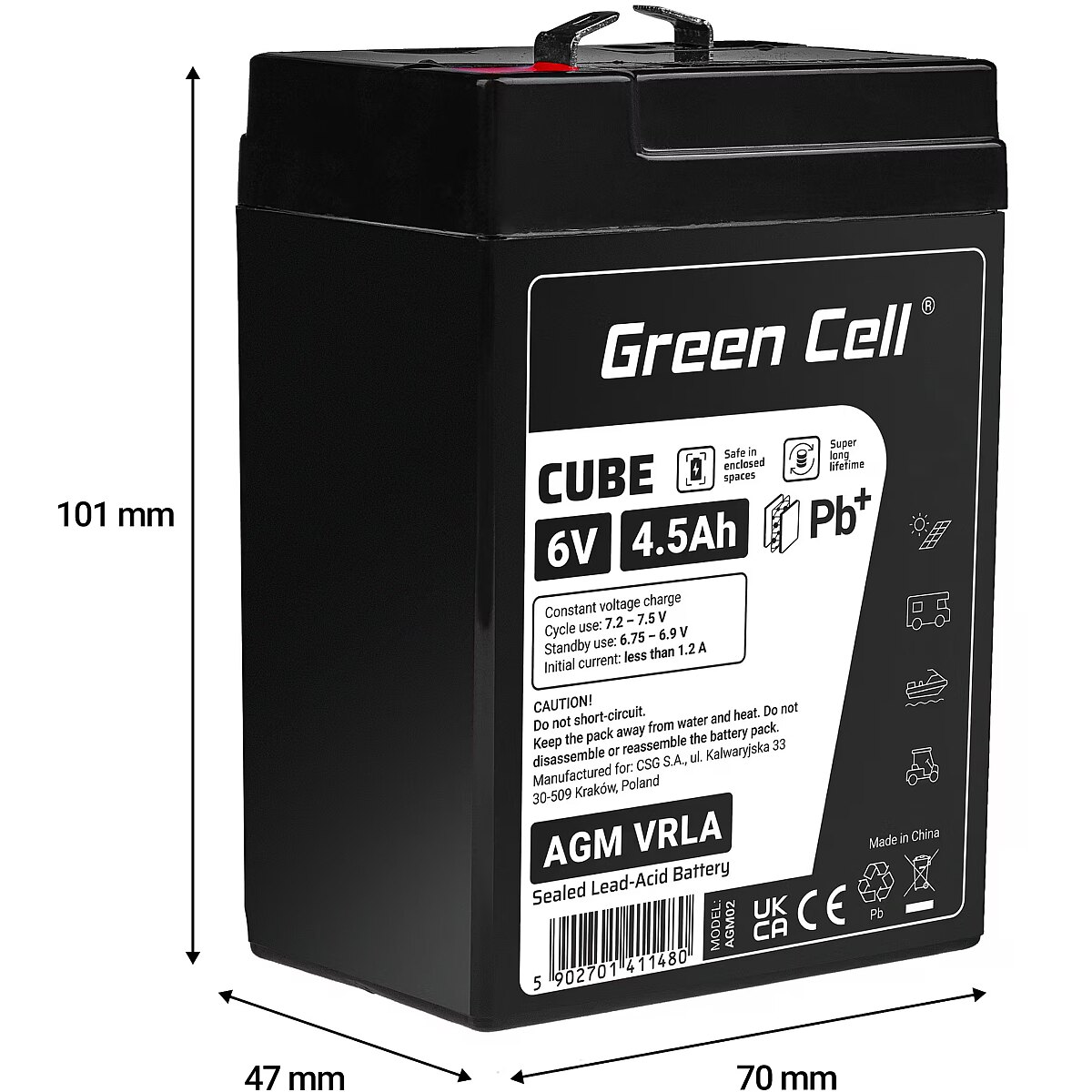 Description - Akumulator AGM VRLA 6V 4,5Ah IP54 Akumulator AGM Green Cell o napięciu 6V to wykonany z wysokiej jakości materiałów model przystosowany zarówno do pracy buforowej, jak i cyklicznej. Akumulator oparty jest na technologii AGM, co oznacza, że elektrolit wchłonięty jest w separator z włókna szklanego, co uniemożliwia jego wyciek. Dzięki temu akumulator może pracować w wielu pozycjach, nie tylko pionowej. Jest to świetna, znacznie bezpieczniejsza alternatywa dla akumulatorów kwasowo-ołowiowych. Gwarancja bezpieczeństwa - certyfikat IP54 zapewnia wysoką ochronę przed dostępem do części niebezpiecznych, a także gwarantuje pyłoszczelność i wodoodporność akumulatora AGM. Długa żywotność - nawet 5 lat bezproblemowej i bezobsługowej pracy akumulatora, niezależnie od sposobu jego użytkowania. Technologia AGM VRLA - elektrolit jest zatrzymany w separatorach z maty szklanej, co zapobiega jego wyciekowi i umożliwia pracę akumulatora w dowolnej pozycji, bez potrzeby uzupełniania elektrolitu. Idealny do pracy buforowej i cyklicznej - ze względu na wysoki prąd rozładowania czy możliwość pracy w dowolnej pozycji, akumulator AGM Cube IP54 ma szerokie zastosowanie i świetnie sprawdza się do pracy cyklicznej i buforowej.