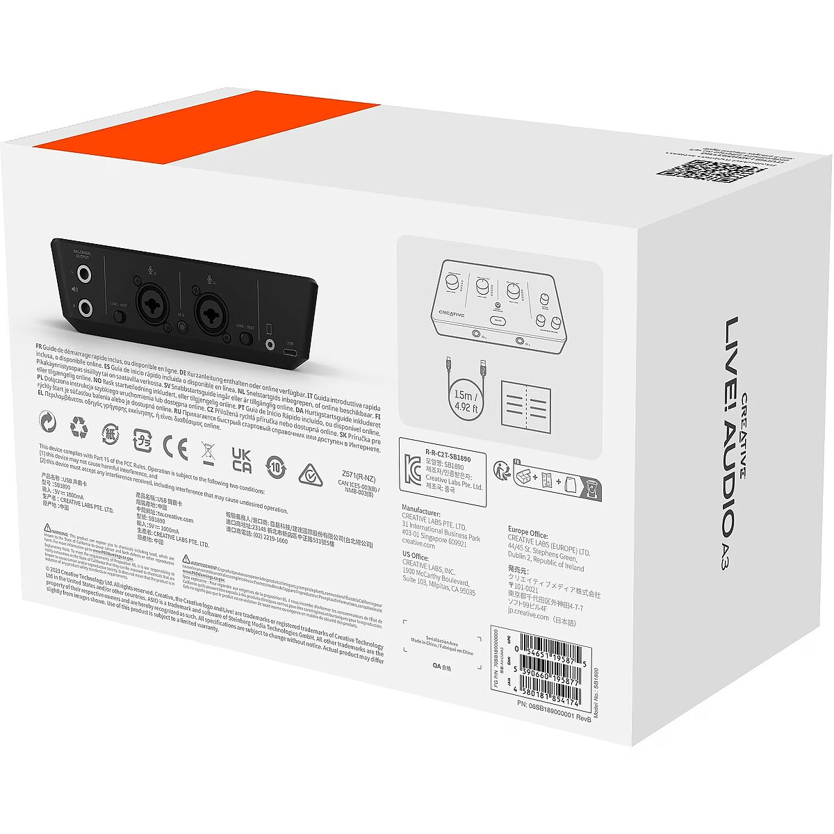 Description - Live! Audio A3 Audio Interface Unleash your creative potential with the new Creative Live! Audio A3 USB audio interface Designed to deliver exceptional 24-bit/96 kHz sound and unmatched versatility, the Creative Live! Audio A3 interface is your gateway to professional audio recording, playback, and mixing, all in the comfort of your own creative space. High-Resolution Playback and Recording Experience audio like never before with the Creative Live! Audio A3, featuring impressive playback and recording capabilities at up to 24-bit/96 kHz. Immerse yourself in the nuances of your audio with stunning clarity and fidelity that captures every detail of your music, podcasts, voiceovers, and more. Enjoy a seamless audio mix Say goodbye to the hassle of caller input interference during remote interviews and podcast recordings. The 3.5mm Mobile Audio I/O jack allows for seamless audio mixing with your phone, ensuring crystal clear communication without interference. Dual L (6.3mm) Headphone Jacks Each jack features individual headphone volume knobs for 2 listeners, providing full control over monitoring levels. Balanced and Unbalanced Stereo Main Outputs Balanced stereo outputs that eliminate electromagnetic interference and noise commonly found in single-ended unbalanced outputs, thus providing higher quality sound. Versatile Dual Combo Jack The dual Combo Jack features a built-in mic preamp and Hi-Z switch, offering compatibility with microphones, line-level devices, and instruments. USB-C Connectivity Experience uninterrupted audio streaming and recording sessions with the reversible, universal USB-C connector.