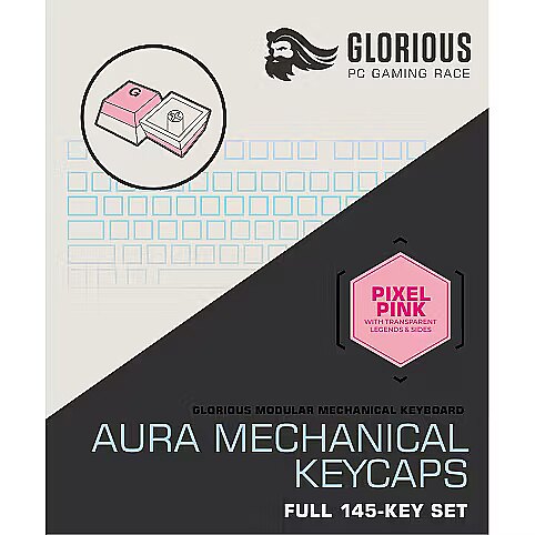 LongDesc - GLORIOUS AURA KEYCAPS V2LET THERE BE LIGHTGo with the glow - unleash your board’s LEDs with this set of PBT, pudding-style, Aura Keycaps. Their transparent legends and sides are designed to show off your board’s lighting, allowing vibrant RGB to fully illuminate the keys.Glorious Aura Keycaps sound as good as they look. Compared to thinner ABS, PBT plastic is resistant to wearing over time and produces a richer, more satisfying tone without unwanted shine.