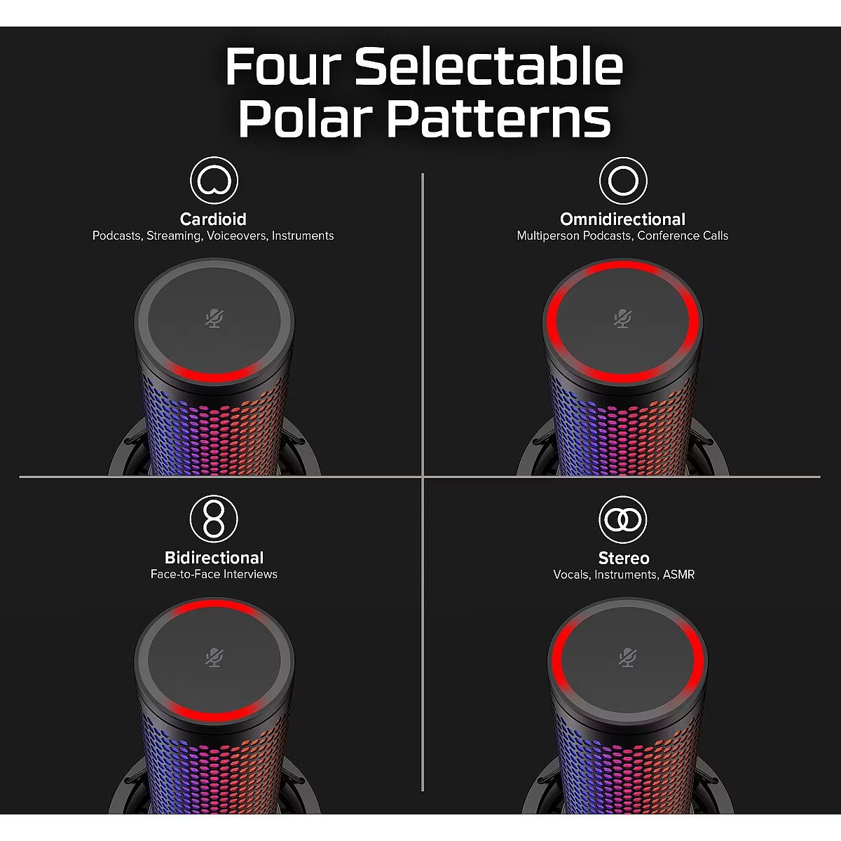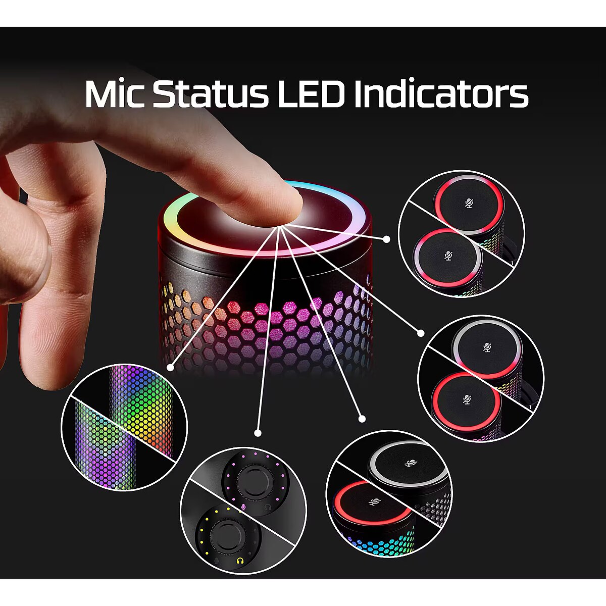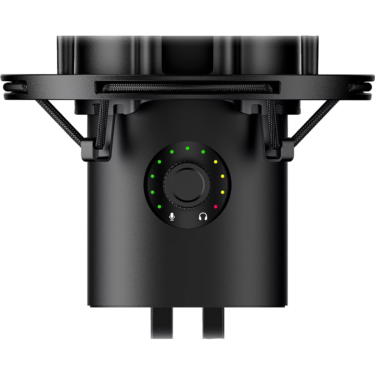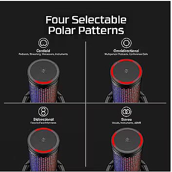 QuadCast 2 S jest wyposażony w miernik VU LED i szereg wskaźników informujących użytkownika o trybie sterowania mikrofonem, stanie wyciszenia, wzorcu kierunkowości i poziomach głośności.