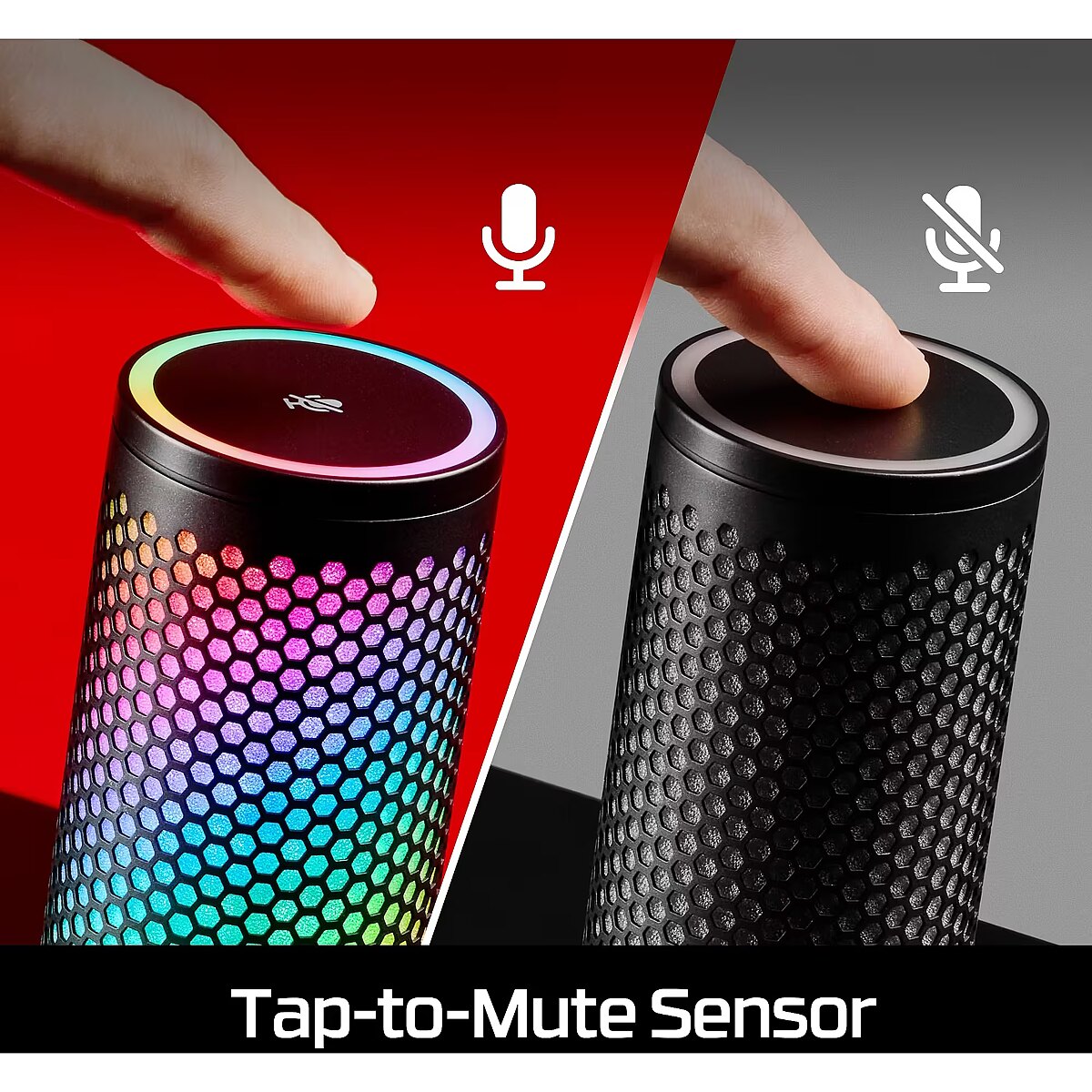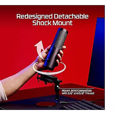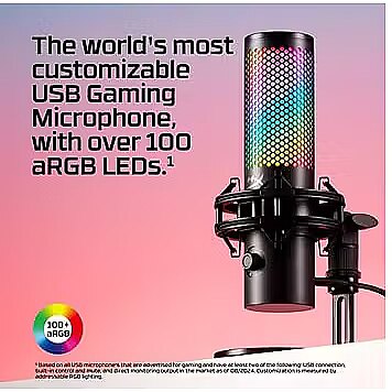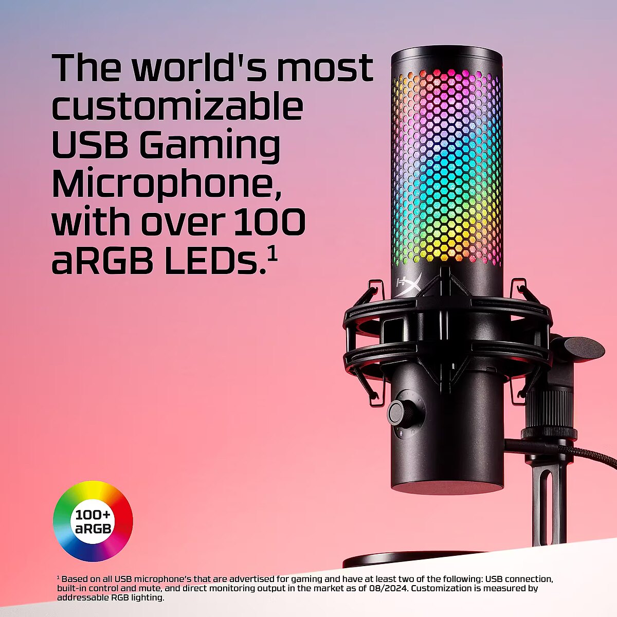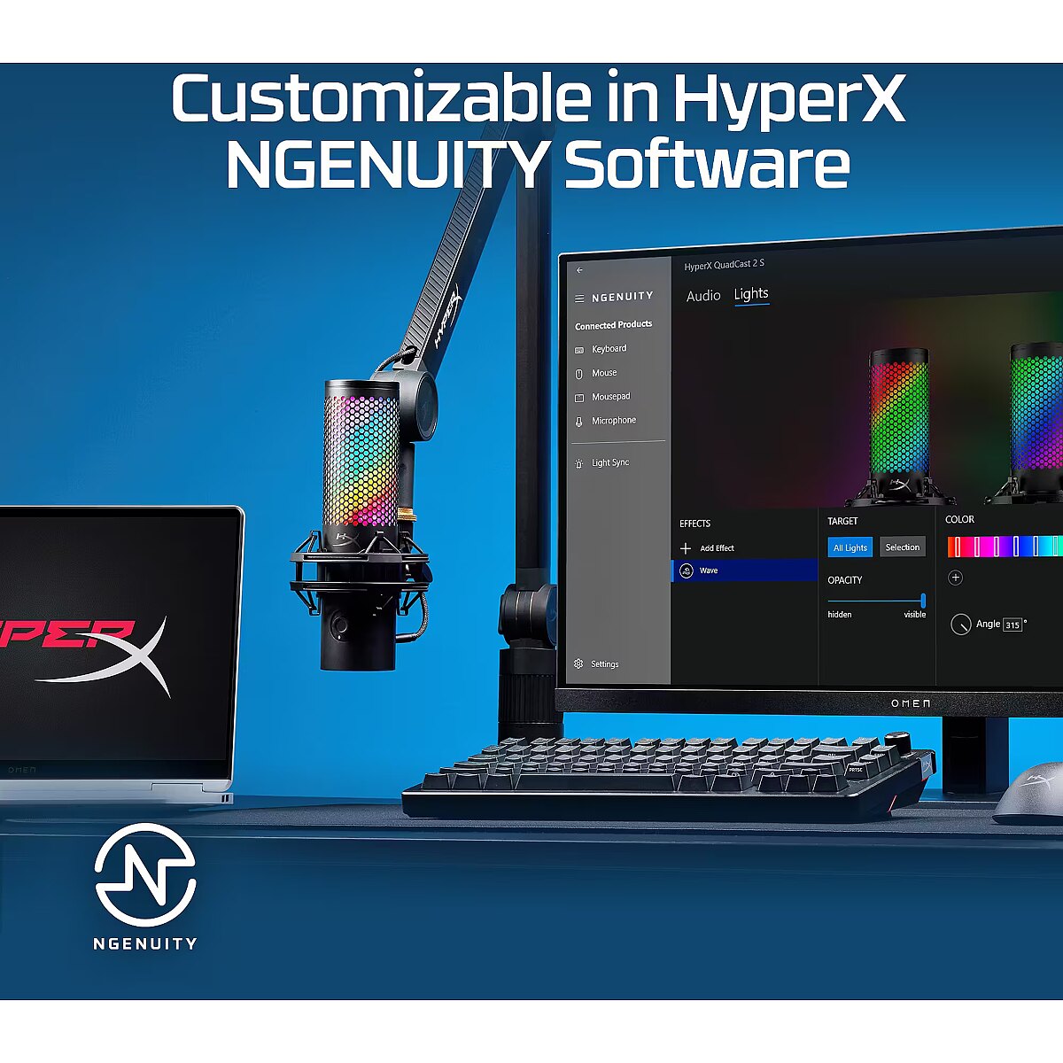 LongDesc - Glow upThe HyperX QuadCast 2 S is a full-featured microphone designed for creators, with features such as a tap-to-mute sensor, four polar patterns, and a shock mount/stand. It has improved audio recording resolution and customizable lighting with 100+ aRGB LEDs. The microphone allows for quick adjustments of levels and has a redesigned shock mount for easy mounting. The HyperX NGENUITY software provides further customization options, including an AI-noise reduction feature. HyperX has delivered a microphone that is truly customized for its community.