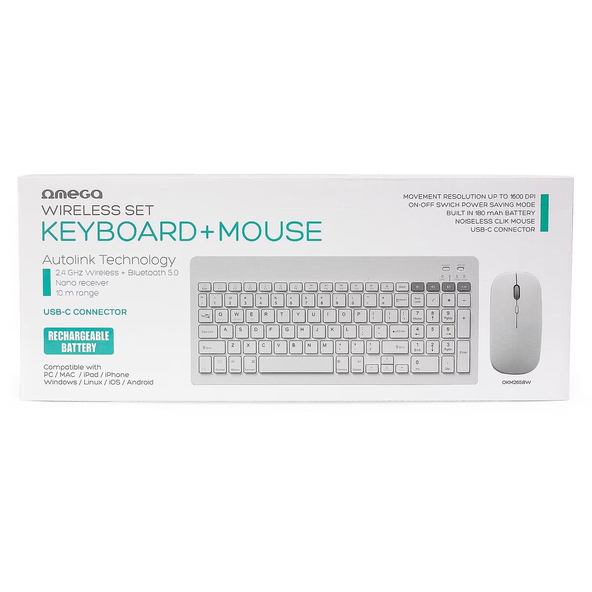 description_en - The Omega wireless keyboard and mouse set offers the perfect combination of style, comfort, and functionality. This ergonomic device set connects via both a 2.4 GHz wireless connection and Bluetooth 5.0, ensuring smooth and stable operation within a range of up to 10 meters. The keyboard features a built-in 180 mAh battery, providing long-lasting performance on a single charge. Its low-profile keys are designed for a comfortable and quiet typing experience, making it an excellent choice for both work and leisure. The mouse, equipped with a 500 mAh battery, offers adjustable DPI settings (800/1200/1600) to adapt to different needs and preferences. A key advantage of this set is its USB-C charging capability, ensuring fast and convenient power restoration. Additionally, the mouse is designed to operate almost silently, contributing to a peaceful and distraction-free work or study environment. The Omega wireless keyboard and mouse set is compatible with a wide range of operating systems, including Windows, Mac, iPad, iPhone, Linux, and Android. With its modern design and intelligent power-saving mode, this set is the perfect choice for users who value both functionality and aesthetics.