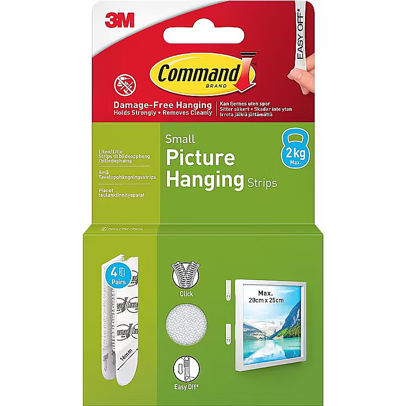 description_en - The 3M Command Strips in white, small size, are the quick and reliable way to mount and organize without damaging your walls or surfaces. Perfect for lightweight frames, decorations, and small household items, they keep your space tidy while ensuring your walls stay free from holes, marks, or sticky residue. Each strip can hold up to 2 kg securely, giving you dependable strength in a compact format. When it’s time to remove or reposition, they come off cleanly without tools, screws, or nails—simply peel away for a damage-free result. This makes them an excellent choice for rented spaces, offices, and any home environment where wall care matters. With their discreet white finish, these small strips blend in seamlessly, offering a neat and subtle mounting solution. Small size, ideal for lightweight frames, décor, and everyday items Holds up to 2 kg securely Works on a variety of surfaces including painted walls, tile, metal, and wood Removes cleanly without holes, marks, or sticky residue No tools, screws, or nails required Each set includes 4 pairs (8 strips in total)