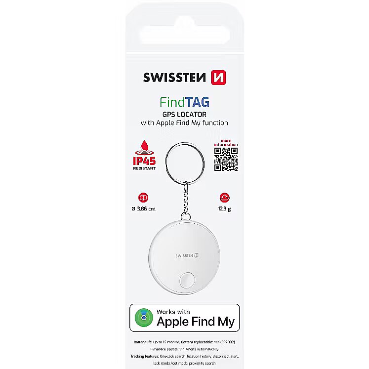 description_en - SWISSTEN Find Tag is a compact smart tracker that helps you easily locate lost keys, wallets, bags, or other valuables. Integrated with the Apple Find My network, it works directly with your iPhone or iPad – no additional apps required. A built-in buzzer and precise location tracking ensure you can quickly find your items, even in challenging conditions. The durable ABS plastic body, IP45 rating, and long battery life of up to 15 months make the Find Tag a reliable companion for everyday use. Instant location with Apple Find My