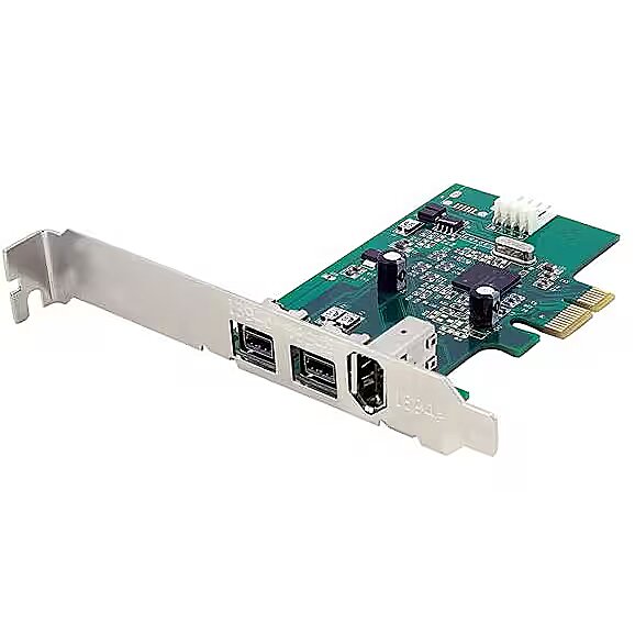 LongSummaryDescription - StarTech.com 3 Port 2b 1a 1394 PCI Express FireWire Card Adapter. Host interface: PCIe, Output interface: Firewire 800 / 400, Expansion card standard: PCIe 1.1. Product colour: Green, Mean time between failures (MTBF): 149905 h. Chipset: Texas Instruments - XIO2213B, Data transfer rate (max): 0.8 Gbit/s. Windows operating systems supported: Windows 10, Windows 10 Education, Windows 10 Education x64, Windows 10 Enterprise, Windows 10..., Mac operating systems supported: Mac OS X 10.10 Yosemite, Mac OS X 10.11 El Capitan, Mac OS X 10.12 Sierra, Mac OS X 10.13 High..., Server operating systems supported: Windows Server 2003, Windows Server 2008 R2, Windows Server 2012, Windows Server 2016, Windows.... Width: 18 mm, Depth: 85 mm, Height: 120 mm