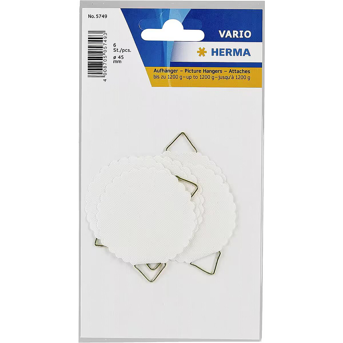 description_en - Herma picture hangers are perfect for hanging photo frames on the wall if the frame doesn't have integrated hanging loops. Easy to install: just moisten the sticker, attach it to the backside of the frame and let dry for 30 minutes before hanging. Hangers are brass-plated and can carry up to 1.2 kg. Sticker diameter: 45 mm Pack of 6