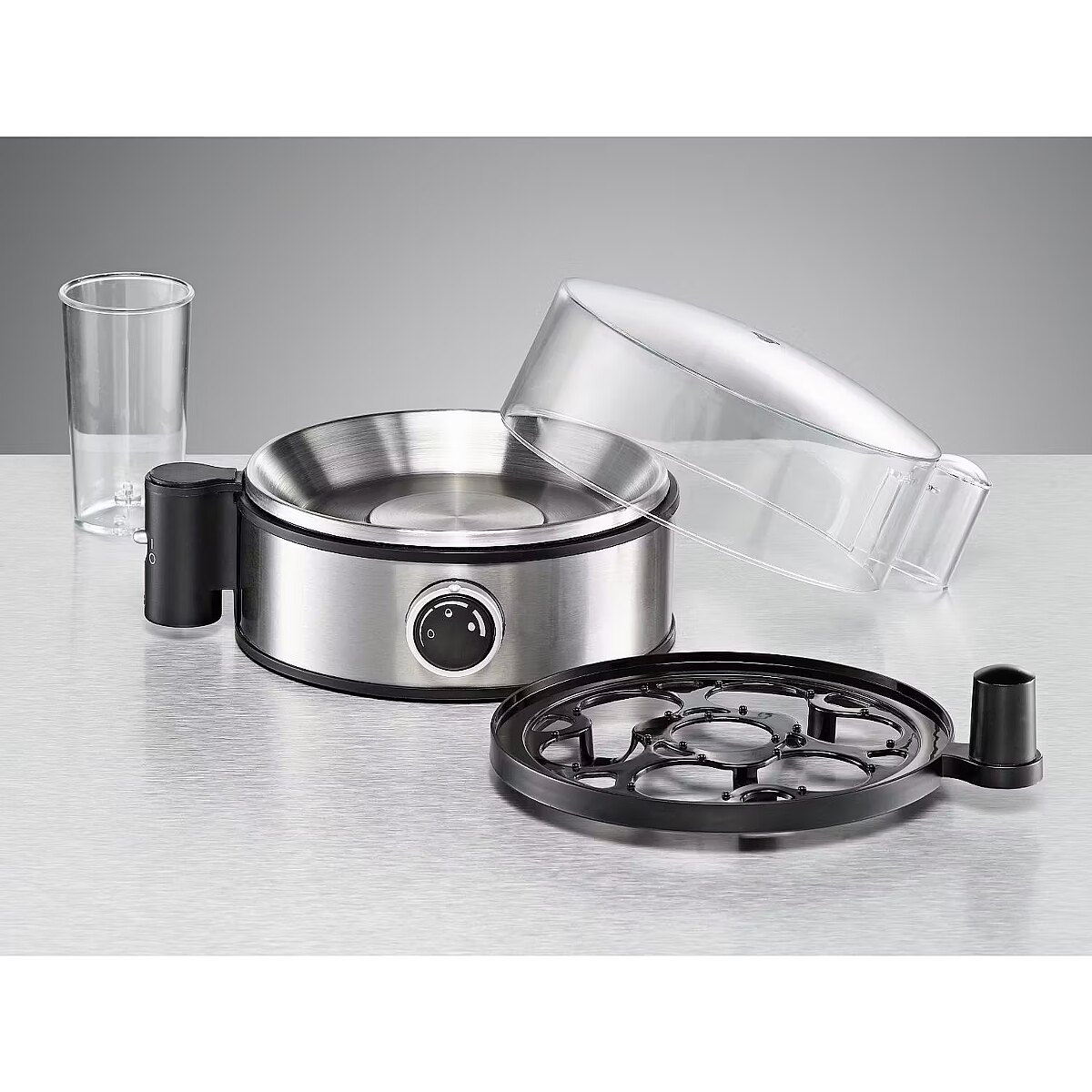 Technical_details - Colour silver/black Design Eierkocher Purpose zum Kochen von Eiern Capacity 1-7 Eier Properties einstellbarer Härtegrad (elektronische Kochzeitüberwachung), abnehmbarer Einsatz for 1-7 Eier, Heizschale aus stainless steel, Signalton; abnehmbare, transparente Abdeckhaube; Display LED-Kontrollleuchte Handling Härtegrad-Drehregler, Ein-/Ausschalter Cleaning einfache Reinigung Input Voltage 230 V Protection Trockengehschutz Storage Compartment praktische cableaufwicklung Power Consumption Operating 400 watt(s) Product dimensions 200 x 170 x 170 mm