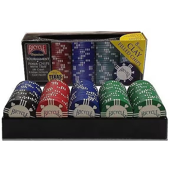 Description - An eye-catching set of 100 poker chips made by the world leaders in card production - USPCC - owner of the Bicycle brand. A set of poker chips by the American brand Bicycle. Weight of a single chip - 8g. The chips are arranged on a black plastic tray. All packed in an attractive cardboard box. Ideal for home games as well as professional tournaments. The chips are available in four colours symbolising different values, but these are not printed on. Instead, the characteristic Bicycle card logo and card symbols such as hearts, diamonds, clubs and spades appear. This treatment makes the chips more versatile when it comes to out-of-the-box use. That is, in tricks, illusions and as a complement to Bicycle cards.