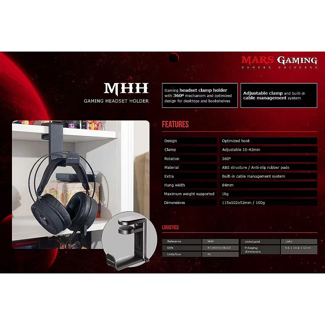description_en - Do you want to have your headset on hand but you need a clear desktop? The MHH is a headset holder designed to keep your headphones close and in the minimum space. With a strong clamp and a 360º mechanism for greater accesibility you will be able to access your headset quickly and keep your cables organized.