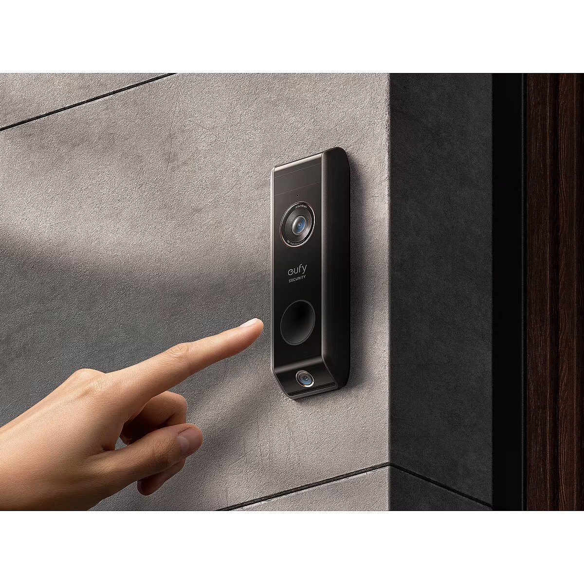 LongDesc - Video Doorbell DualSmart package detection, collection reminders and monitoring in one compact device.Two cameras.Absolute security.While the Video Doorbell Dual's front-facing camerafocuses on the postman, the additional downward-facing camera sees the package. At the same time, the second camera can even be moved to the left or right to get an almost unlimited view of the entrance area.DeliveryGuard™The exclusive Delivery Guard™ technology provides smart delivery notifications and pick-up reminders so that you can react immediately.pickup remindersVideo Doorbell Dual reminds you when packages have been forgotten so that friends or acquaintances can pick them up.packet detectionVideo Doorbell Dual notifies the family when a package arrives or when someone approaches the package. The emergency contact can even be called directly from the eufy security app for help.Accurate alerts with dual detectionMotion detection reduces false alarms by 95%.Every detail in 2K HDVideo Doorbell Dual identifies who is at the door in seconds thanks to the power of 2K HD .Smart light settingsWith high dynamic range visuals (HDR), even visitors backlit by the sun can be seen with perfect color and claritySecurity & economyThat means no one but family can access the data — and all without cloud service fees.
