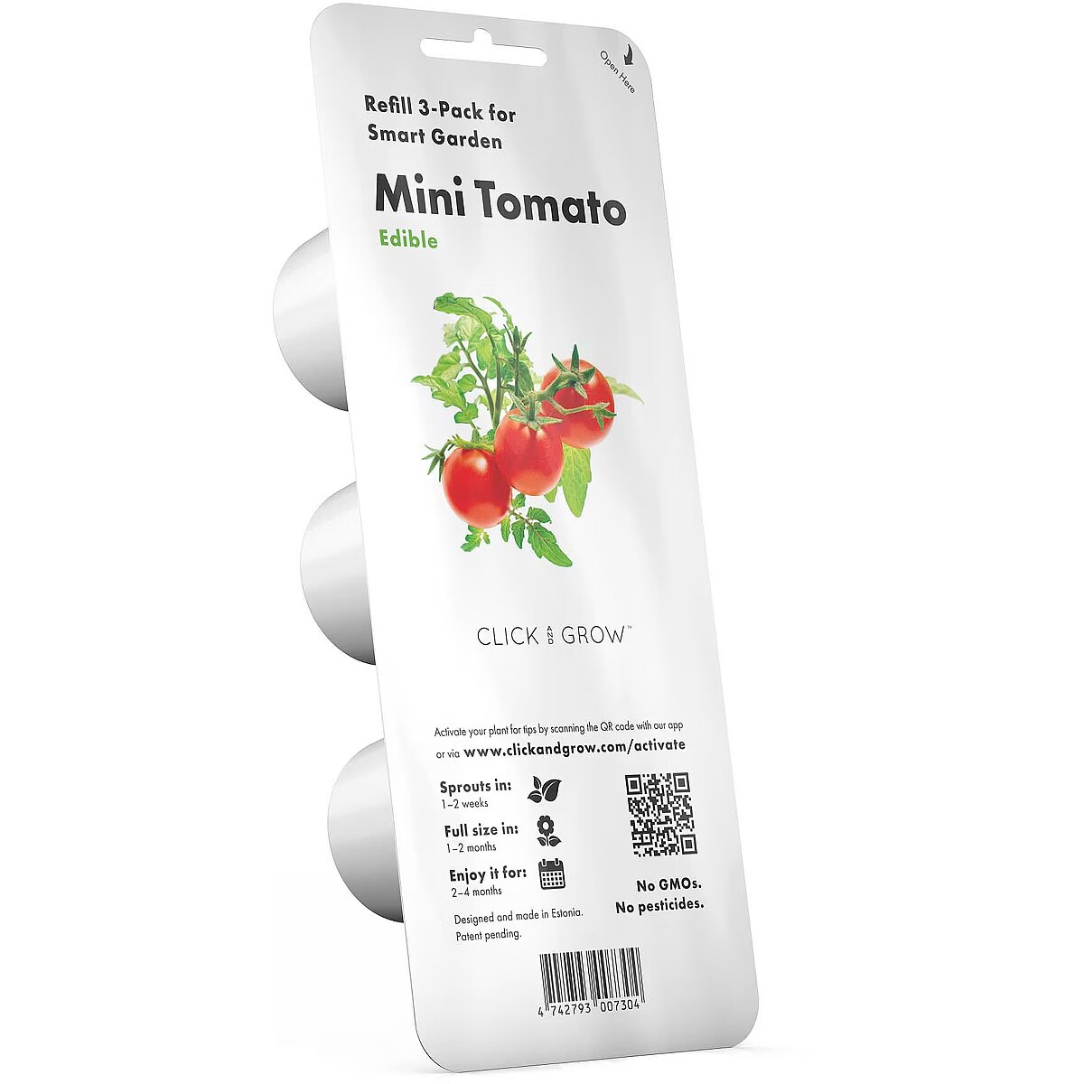 description_en - This cartridge contains mini tomato seeds that will sprout easily when installed. Mini Tomato facts These little red tomatoes make for an extremely tasty snack or healthy salad. You can even use them in a cocktail or for food decorations. More Details Includes 3 mini tomato seed plant capsules. This plant can be started year-round with adequate light conditions, sprouts in 2 to 3 weeks, and grows to full size in 2 to 3 months. Use the capsules only with a Click & Grow Smart Garden (sold separately). We're switching to a more sustainable plant capsule system, and you might receive your plant capsules without the plastic around the Smart Soil. This system works with the older Smart Herb Garden also, just don't throw away the plastic capsules!
