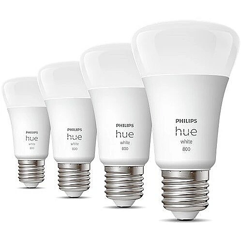 LongSummaryDescription - Philips Hue White 4-pack E27. Type: Smart bulb, Interface: Bluetooth, Product colour: White. Mobile operating systems supported: Android 10.0, Android 11.0, Android 12.0, Android 13.0, Android 7.0, Android 8.0, Android 9.0,.... Energy efficiency class: F, Energy consumption per 1000 hours: 9 kWh, Power consumption (standby): 0.41 W. Width: 61 mm, Depth: 61 mm, Height: 110 mm. Package type: Box, Package width: 146 mm, Package depth: 14 mm