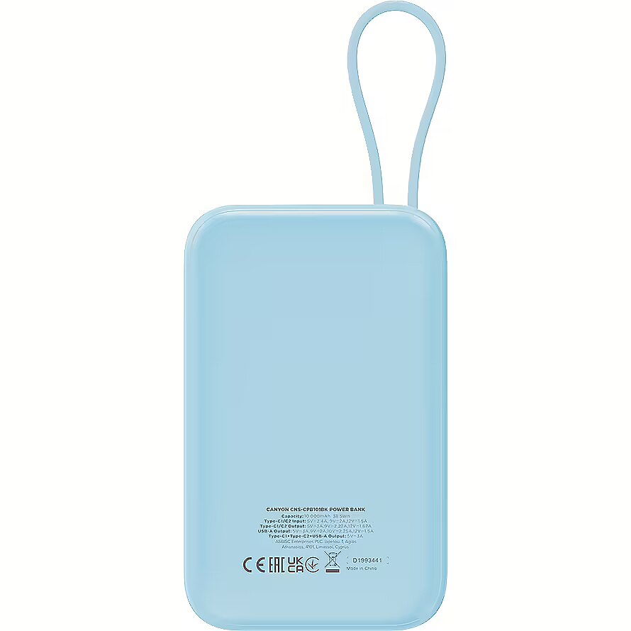 Komerciālais nosaukums - CANYON power bank OnPower 101 built-in cable 10000 mAh PD22.5W Blue