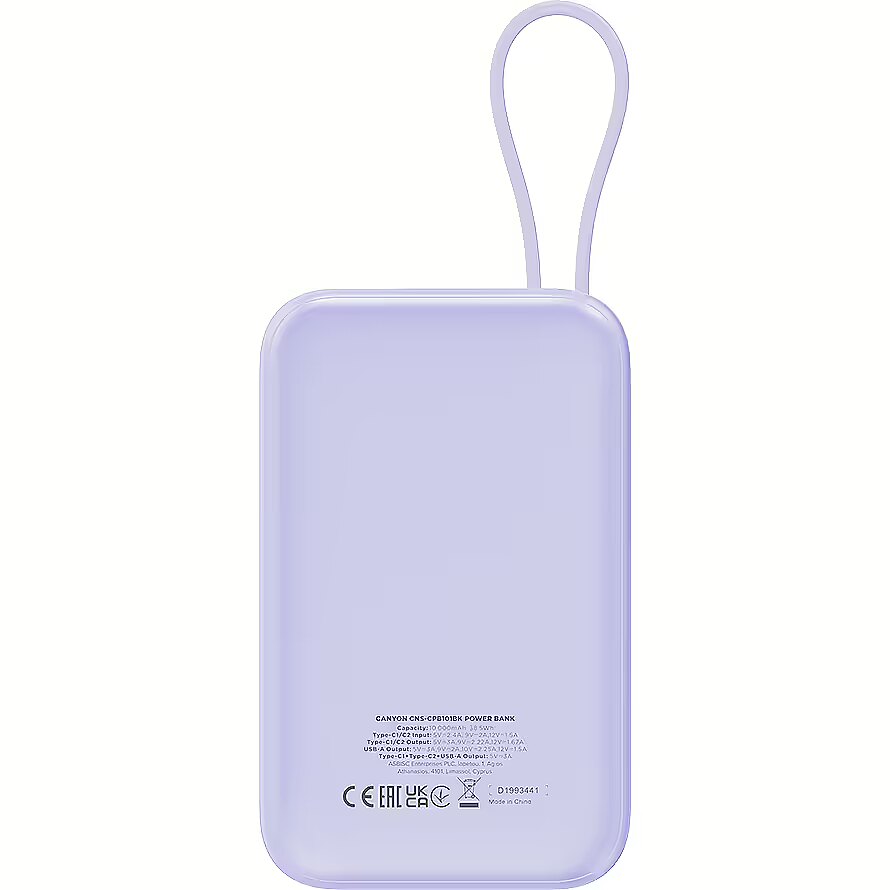 Komerciālais nosaukums - CANYON power bank OnPower 101 built-in cable 10000 mAh PD22.5W Purple