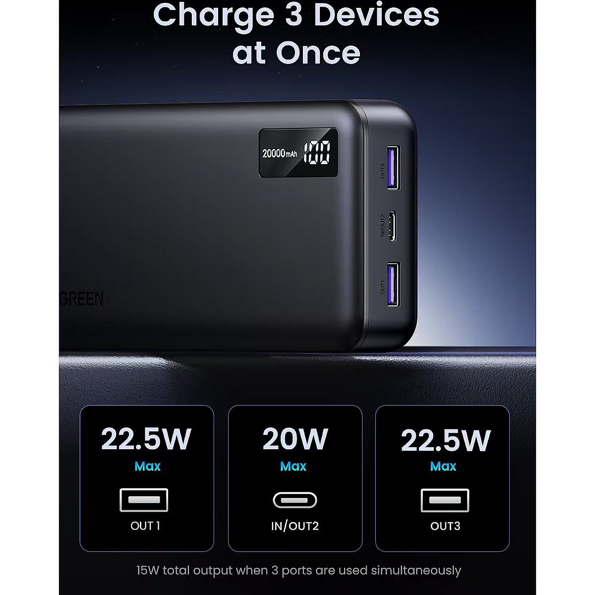 LongDesc - "*USB-C Input/0utput: 5V=3A 9V=2.22A 12V=1.67A 20W Max*USB-A (OUT 1/OUT 2) output: 10V=2.25A 9V=2A 12V=1.5A 5V=3A 22.5W *Total output: 5V=3A Max*Battery capacity: 20000mAh 3.7V (74Wh) *Rated capacity: 12500mAh (TYP 5V 3A)*Output Capacity: 12500mAh (5V/3A);7000mAh (9V/2.22A);5100mAh (12V/1.67A);6400mAh (10V/2.25A Max)*Cell Capacity: 20000mAh(2x10000mAh) *ChargingTime: About 6 hours (with PD 20W charger)*Dimension: L147×W72×H27(mm) *Multiple protection such as: Over charge/Over discharge/Over current/Over power/ Over voltage/Over temperature/Short circuit/Electromagnetic field"