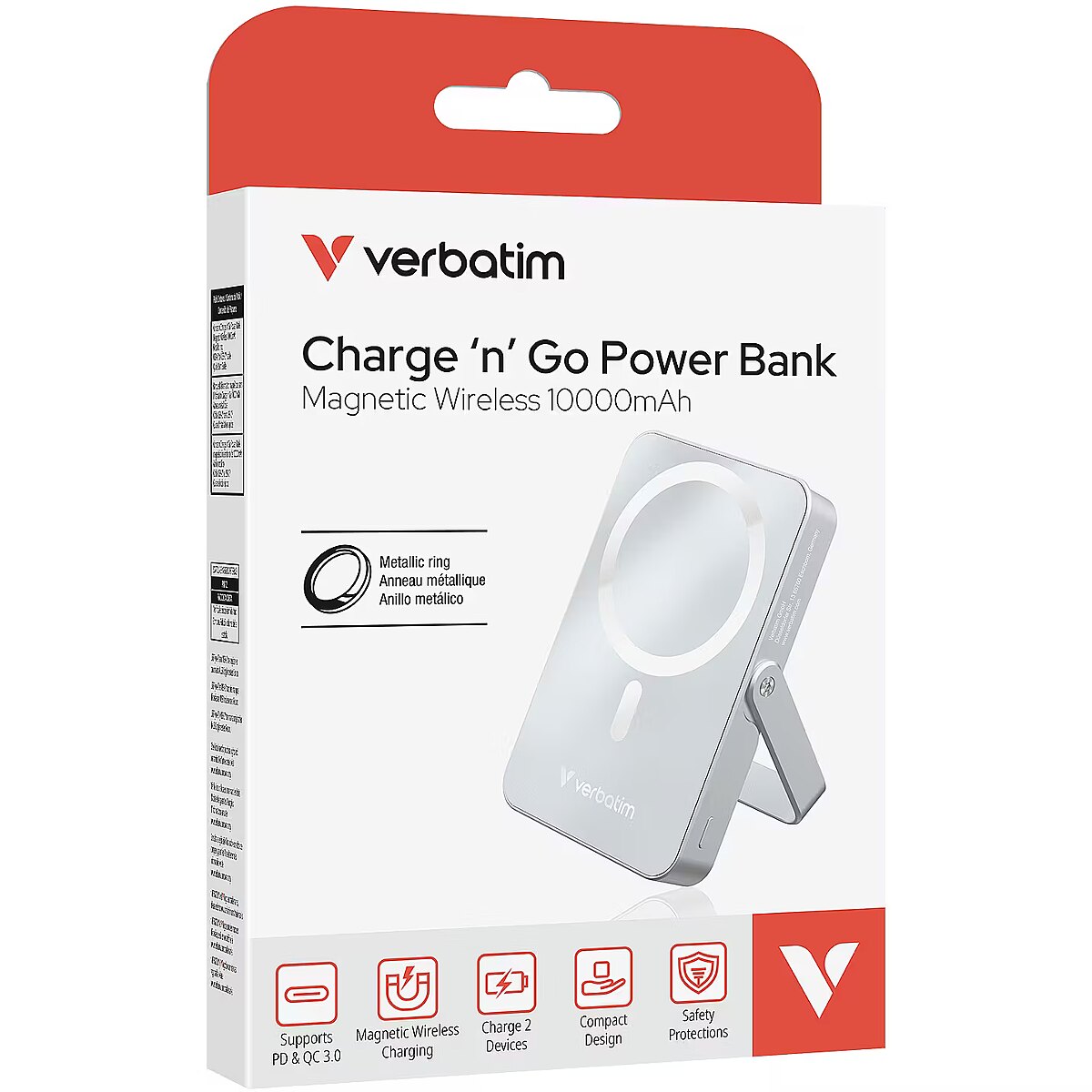 LongDesc - Compact & Reliable EnergyStay powered wherever life takes you with the Verbatim Charge 'n' Go Power Bank. Featuring a robust 10,000mAh capacity in a slim, travel-friendly design, it’s the ideal companion for your devices. From smartphones and tablets to speakers, this power bank ensures seamless charging during commutes, trips, or outdoor adventures. With its sleek, lightweight design, it’s perfect for anyone who needs power on the go.Dual Charging VersatilityExperience the convenience of 15W magnetic wireless charging and 20W USB-C® PD fast charging. Compatible with MagSafe for iPhones and versatile enough for Android devices*, this power bank meets the demands of modern lifestyles. Whether camping, commuting, or working remotely, it ensures quick, efficient charging.Hands-Free ConvenienceThe built-in foldable stand allows you to position your device in portrait or landscape mode while charging. Whether following a recipe, watching a film, or taking video calls, enjoy hands-free functionality that adapts to your needs.