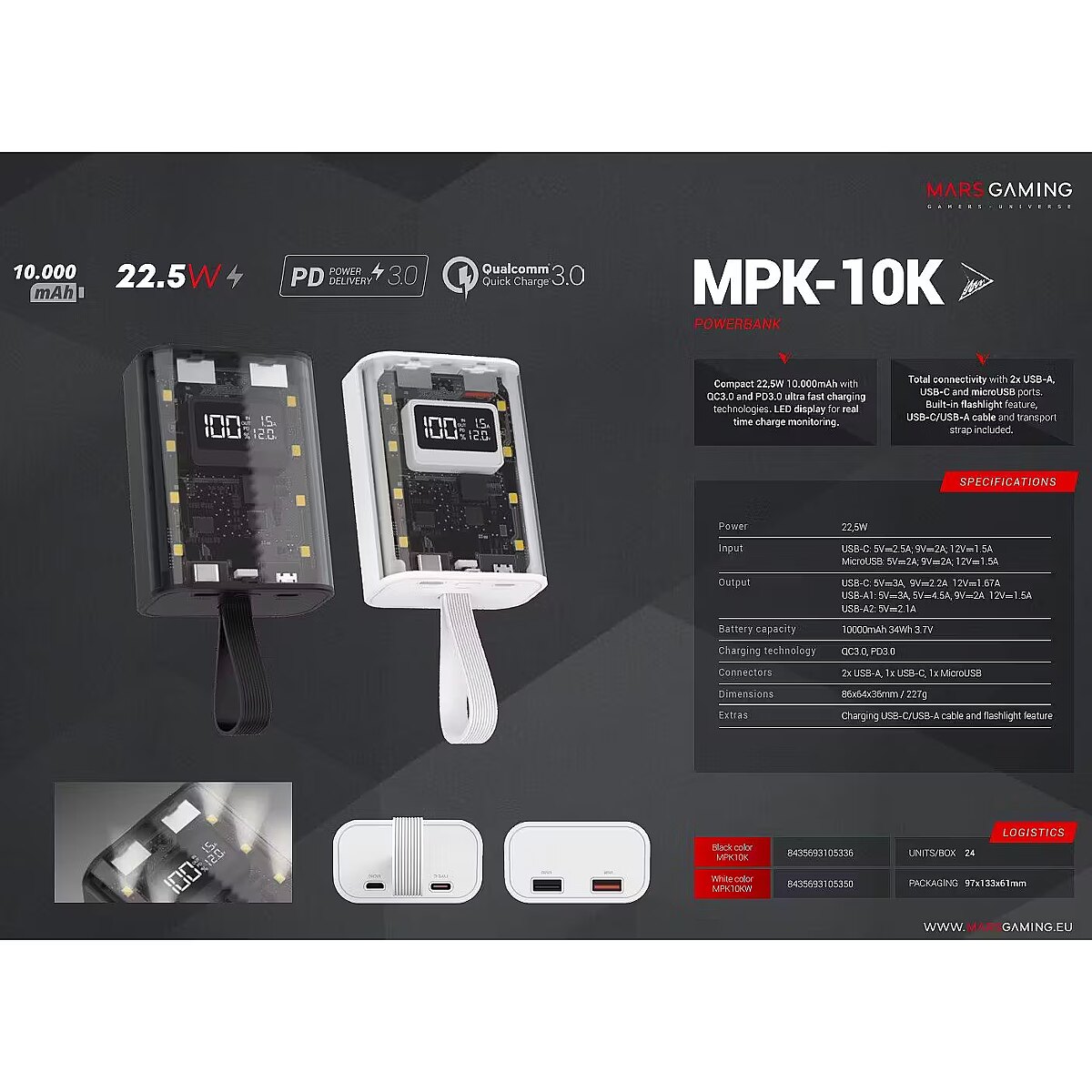 LongDesc - The MPK-10K is a revolution in portable battery design and functionality. With its distinctive transparent design and compact size, this 10000mAh 22.5W power bank offers ultra-fast charging with QC3.0 & PD3.0 technology. Featuring a powerful LED flashlight and strap for easy carrying, a display to monitor battery status, universal compatibility and the ability to charge up to three devices simultaneously, the MPK-10K is ideal for those on the go.STYLE AND COMPACT FUNCTIONALITYDiscover the perfect balance of sophistication, technology and practicality with the MPK-10K power bank. Its unique, compact design features a transparent casing that reveals the internal electronics, offering an exceptional charging experience unlike any other portable battery.AVAILABLE IN TWO VERSIONSBLACK OR WHITEChoose yours!REVOLUTION IN FAST CHARGING AND SIMULTANEOUS CHARGINGThe MPK-10K offers a fast and safe charging experience. Incorporating advanced QC3.0 & PD3.0 technology, this 10000mAh 22.5W portable power bank ensures ultra-fast and efficient charging. Plus, you can charge up to three devices simultaneously. Connect and charge your phone, tablet and headphones at the same time and make sure they're always available and ready to go. INTELLIGENT BATTERY MONITORINGLeave behind worries about the charge level of your power bank. The MPK-10K comes equipped with a smart display that informs you in real time about its charging status. This innovative feature gives you peace of mind and full control over your device, making it easier to organize your day-to-day life with the assurance that your power bank will always be ready when you need it.VERSATILE CONNECTIVITYEquipped with 2 USB-A ports, a USB-C port and microUSB, this power bank offers wide compatibility with your phone, tablet or any other device. The MPK-10K allows you to always have your devices at your disposal when you need them.POWERFUL LED FLASHLIGHTThe MPK-10K redefines portable battery functionality with its powerful, integrated LED flashlight. Equipped with multiple lighting modes, including an emergency flashing mode, it makes for an exceptionally versatile device, ideal for tackling everyday situations.COMPACT TRANSPORTABLE SIZEIts compact design makes it perfect for travel, hiking, or just everyday use. With an integrated strap for easy carrying, the MPK-10K is easy to take with you wherever you go, combining convenience and functionality in one device.
