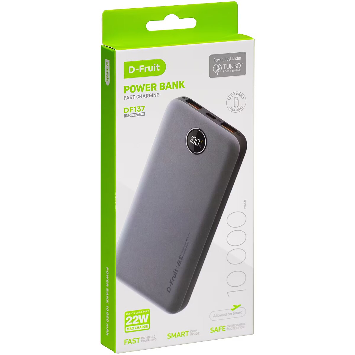 description_en - A power bank is an extremely convenient tool in the smart age. It allows you to charge not only your smartphone, but also Bluetooth headphones, tablets and other devices when you are away from a wall outlet. This way, you don't have to worry about whether the battery will last until the end of the day. With a power bank, you can leave your smart device charging at the bottom of your bag and happily carry on with your daily activities. The D-Fruit DF137 power bank has a capacity of 10,000 mAh, allowing you to fully charge your smartphone several times. Thanks to two USB and one USB-C port, you can charge three devices simultaneously. The power bank supports Power Delivery and Qualcomm Quick Charge 3.0 fast charging. A digital LED display displays the charge level of the power bank and a 20 cm charging cable is also included. 10 000 mAh capacity Maximum output power: 22 W Supports Power Delivery and Quick Charge 3.0 fast charging USB-C port can be used to charge both devices and the power bank itself Digital LED display shows the power bank's charge level Suitable for hand luggage and air travel Charging cable included