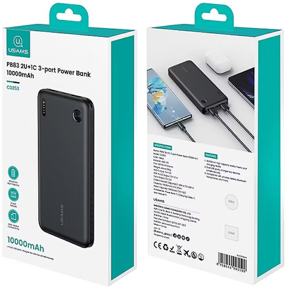Description - Powerbank USAMS PB83 2xUSB-A 1xUSB-C 10000mAh Powerbank USAMS PB83 2xUSB-A 1xUSB-C 10000mAh is a versatile solution for people who need power, flexibility and charging speed. The capacity of 10 000 mAh allows you to repeatedly add a smartphone, headphones or tablet the ideal companion for travel, at work or during outdoor activities. Two USB-A ports allow you to charge several devices at the same time and quickly connect different types of hardware compatible with modern charging speed standards. The model is equipped with PD (Power Delivery) technology, which guarantees efficient and safe charging of compatible devices. The case made of durable materials provides resistance to everyday use, and the compact format makes the powerbank fit in a pocket, bag or backpack. Thanks to the charging status indicator and advanced protection against overcharging, overvoltage, overheating and short circuit the use of the device is safe and convenient. Powerbank USAMS PB83 2xUSB-A 1xUSB-C 10000mAh is a great proposition for users with more than one device with USB-C or those who expect versatility and speed of operation in one compact device.