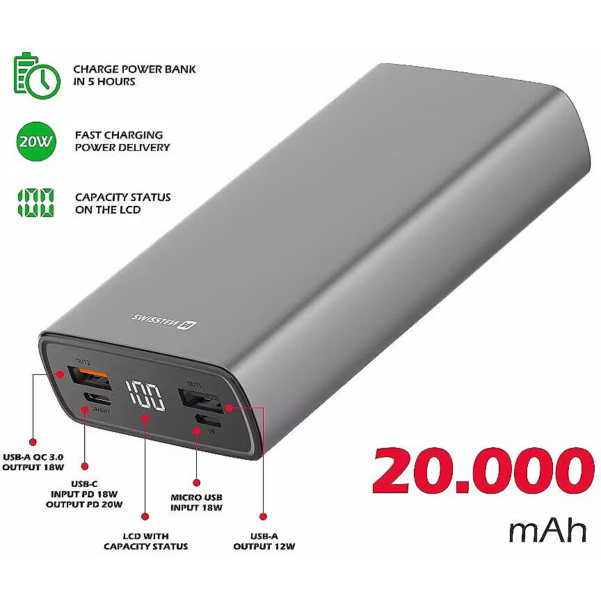 description_en - SWISSTEN aluminium powerbank with 20.000mAh capacity, microUSB and USB-C inputs, 2xUSB-A, 1xUSB-C outputs and PD and QC fast charging.