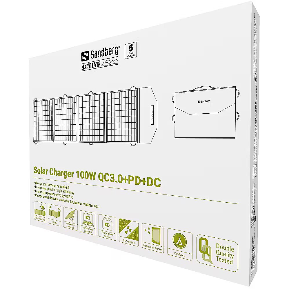 LongSummaryDescription - Sandberg Solar Charger 100W QC3.0+PD+DC. Rated power: 100 W. Solar cell type: Monocrystalline silicon, Installation type: Ground, Product colour: Black. Package width: 370 mm, Package depth: 110 mm, Package height: 110 mm. Weight: 4.5 kg, Folded width: 35.5 cm, Folded height: 46.3 cm