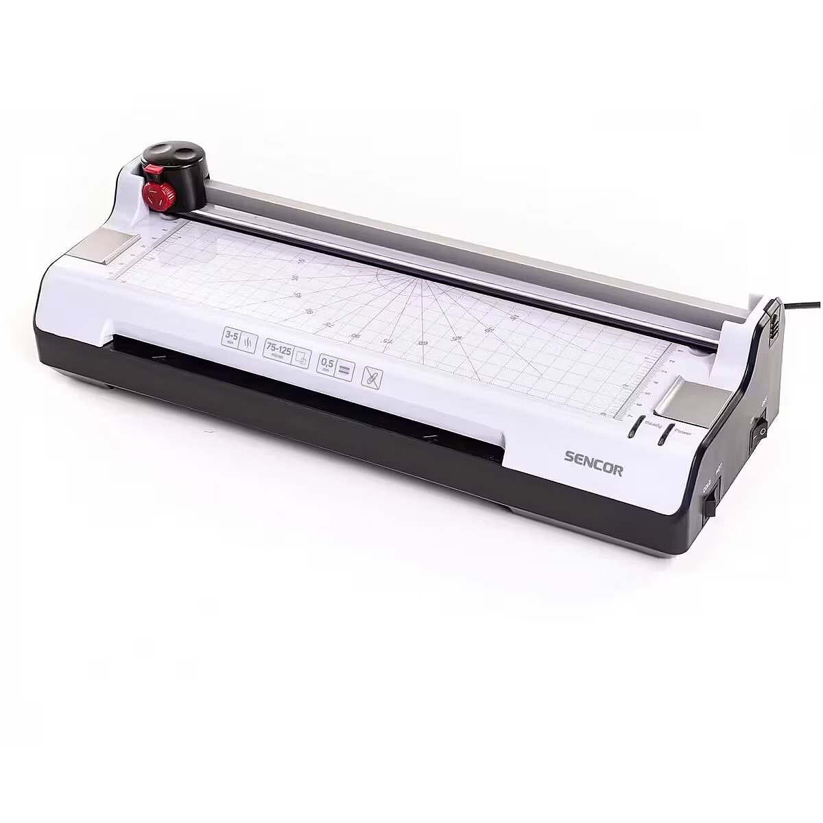 Other features - Do folii 2x75-2x125 mikronów 2 spirale grzewcze Prędkość laminowania A4/1:15 min Uwalnianie zakleszczonych folii Gilotyna umożliwia wykonywanie trzech typów cięcia: cięcie proste, cięcie faliste, cięcie perforacZaokrąglarka narożnikówyjne.