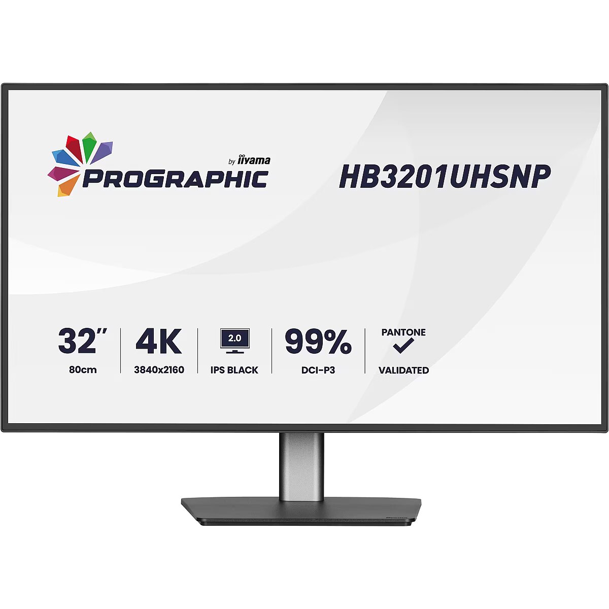 LongSummaryDescription - iiyama ProGraphic HB3201UHSNP-B1. Display diagonal: 80 cm (31.5"), Display resolution: 3840 x 2160 pixels, Display surface: Matt, Response time: 4 ms, Viewing angle, horizontal: 178°, Viewing angle, vertical: 178°. Built-in speaker(s). Built-in USB hub, USB hub version: 3.2 Gen 1 (3.1 Gen 1). VESA mounting, Height adjustment. Product colour: Black