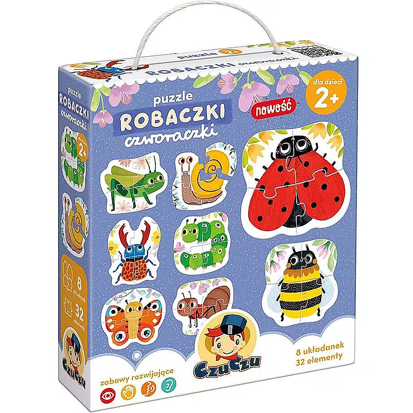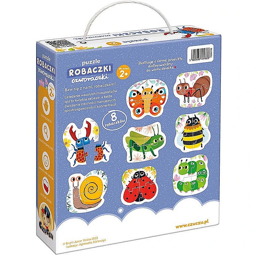 Description - Four-legged Worms Puzzle What's in the grass? Cute little bugs invite you to join the adventure with puzzles! In a handy box lived 8 nice insects and other tiny inhabitants of the meadow and garden. Each consists of 4 large elements. The form of the product and beautiful illustrations make the set perfect as the first few-element puzzles for children who continue their adventure with more and more difficult puzzles. Puzzles inspire to many different games. They are fantastic for home, travel and play together. Perfect the skill of arranging increasingly difficult puzzles with the new series: Step 1: Pair Puzzle Animals in the Countryside Step 2: 4 Piece Puzzles Worms Four Step 3: Progressive Puzzle Construction site vehicles and Animals in the forest. Unique feature: Large and durable pieces are sized to fit little hands. Puzzles encourage play in a variety of ways. Have fun and practice different skills.
