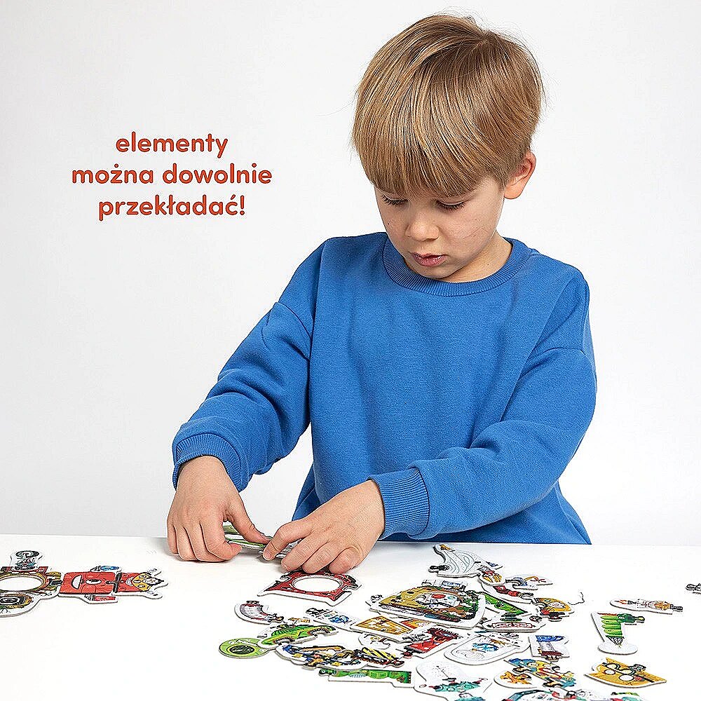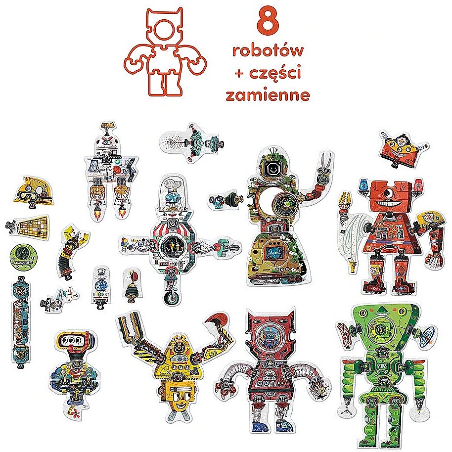 Description - Creative puzzle 63 pieces - Robot Lab Calling young constructors to our workshop! In the educational set you will find 63 pieces, 28 of which are double-sided. Most importantly, they can be freely combined with each other! You can build 8 large robots from the box and then, thanks to the interchangeable parts, change their appearance and functions at will. You can also design your own robots and create other constructions! A unique feature: all puzzles can be combined with each other at will, giving you lots of possibilities for fun. The Robot Lab creative puzzles allow for lots of creative and developing fun. It is not only a great way to develop small motor skills, perceptiveness and imagination, but also to get preschool children interested in technology and inventions. Start the fun by arranging the 8 robots. Take a look at them and guess what they might be used for? Find a cat robot and a fireman robot! Use spare parts to change and improve existing constructions. Build constructions using as many parts as possible. Or build a robot with specific colours. How about drawing your own machines? Or create even more spare parts from cardboard and paper? Build your own robots your imagination and the possibilities for fun are endless!