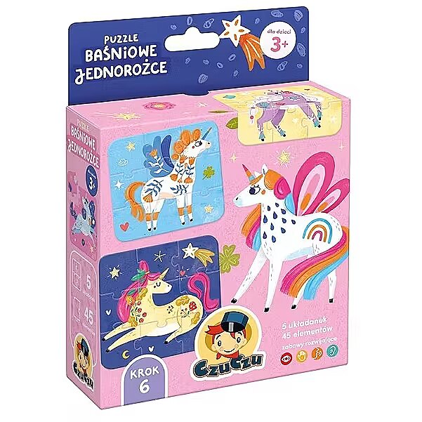 Description - Puzzle 60 pieces Oh Unicorns Hocus-pocus! Can you hear the pounding of magic hooves? A large and fabulously colorful puzzle consists of 60 elements and presents 10 charming horses from a magical land. Puzzles are a fantastic gift idea for creative preschoolers. Putting together puzzles is an imaginative game that is worth inviting siblings and friends to! Unique feature: beautifully illustrated puzzles inspire a variety of play. Ah Unicorns puzzle consists of 60 elements. This fabulously (literally) colorful puzzle is a great idea for a smart and developing toy for preschoolers, especially those who like fairy tales, fairy tales and magical stories. By arranging puzzles, children can improve fine motor skills, perceptiveness, patience and concentration as well as ingenuity. Solving the puzzle is just the beginning! Have fun in different ways. Arrange the puzzles and do it in your favorite company and place (thanks to the handy box you can take them on holiday). Get to know the magical horses and pay attention to various details, what do you think the heroes of the illustrations like? How about an enchanted math lesson? Count the unicorns and pegasi. How many of them have wings? How many hooves do you see in total? Check how the CzuCzu unicorns differ from each other and how similar they are. Invent your own fairy tales and tell tales of an enchanted land. Even more magic read your favorite fairy tales together. Redraw the unicorns or draw your own magical horses and their friends. Or maybe you will draw their land? Ah, how pleasant!