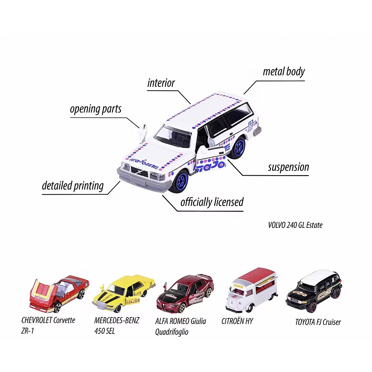 Description - Majorette 60th Anniversary Premium, 5 types Metal cars from a limited edition created to celebrate 60 years of the Majorette brand (1964-2024), with special graphics on the body with Majorette logos from different years. Vehicles without drive, with opening elements, such as doors or trunk and shock-absorbing suspension. Scale: 1:64. Length: 7.5 cm. Jubilee models for the 60th anniversary of the Majorette brand - the birthday edition contains 5 iconic models from the 60th year of automotive history, each car represents a different era and its aesthetics. Time travel in miniature format - a great gift set for collectors, nostalgists and automotive enthusiasts, distinguished by an opening hood and perfect imitation of plastic lights, these springs add uniqueness to every collection of car models. Each model with opening elements represents a different decade Citroën HY (1968), Mercedes-Benz 450 SEL (1975), Volvo 240 GL (1985), Chevrolet Corvette 1990 ZR-1 (1990), Alfa Romeo Giulia (2015) Expand your Anniversary Edition collection - you can complete more models with products no.: 212054101, 212054102, 212054103 Majorette has been the most famous manufacturer of vehicle models since 1964, combining tradition with innovation, our models are characterized by first-class quality of workmanship. A journey through the history of the automotive industry: Majorette birthday edition for the 60th anniversary of the brand! On the occasion of the 60th anniversary of the creation of Majorette car models, 5 classics from the history of the automotive industry have been collected in ONE gift set. Each vehicle model comes from a different decade of the last 60 years and tells its own story of craftsmanship and automotive design. 5 die-cast cars to collect, each representing a different decade - - a real treat for collectors, car enthusiasts and Majorette fans: 1960-1970: Citroën HY (1968) 1970-1980: Mercedes-Benz 450 SEL (1975) 1980-1990: Volvo 240 GL (1985) 1990-2000: Chevrolet Corvette 1990 ZR-1 (1990) 2010-2020: Alfa Romeo Giulia (2015) When ordering, you will receive ONE car (7.5 cm), the selection will be made randomly. 60 years of tradition and innovation! In addition to the 5 officially licensed car models (each 7.5 cm long), the Majorette lettering on the toy cars is also true to the original from the period and thus embodies the history of the Majorette brand in a particularly original way. What has not changed in 6 decades of Majorette: Our passion for cars and attention to detail. Each toy car from this birthday series is made of high-quality metal and equipped with suspension and an opening part - a great gift for playing, chasing in the comfort of the room and collecting! The opening elements allow children to develop their motor skills while stimulating their imagination. Majorette is a cult French brand that has been enchanting car enthusiasts around the world since 1964 with its current collections of licensed metal cars, which reflect the special features of famous car brands down to the smallest detail. In the Majorette range you will find passenger cars, monster trucks, emergency vehicles, construction machines or racing cars. Majorette offers a large selection of metal toy cars, as well as parking sets with various themes Various designs. Product sent randomly, no possibility to choose a specific model. Price for 1 pc.