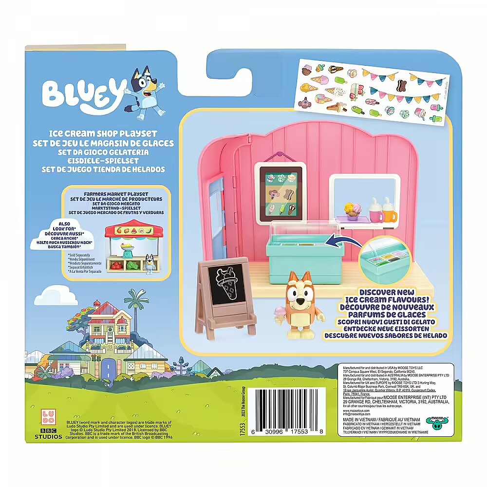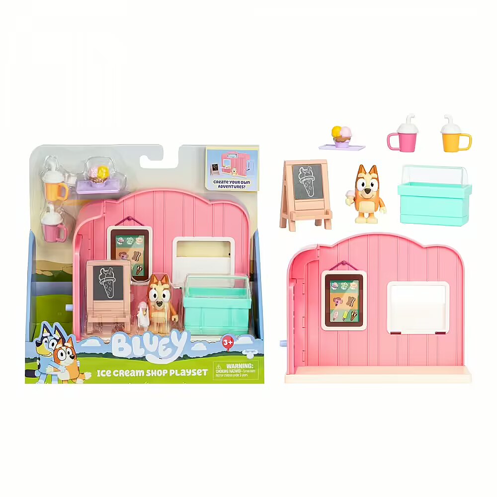 Description - BLUEY MINI ICE CREAM SHOP SET Recreate your favorite scenes from the series and join Bingo in the ice cream shop. Serve ice cream from the freezer in a special cone and play the role of a little ice cream vendor.