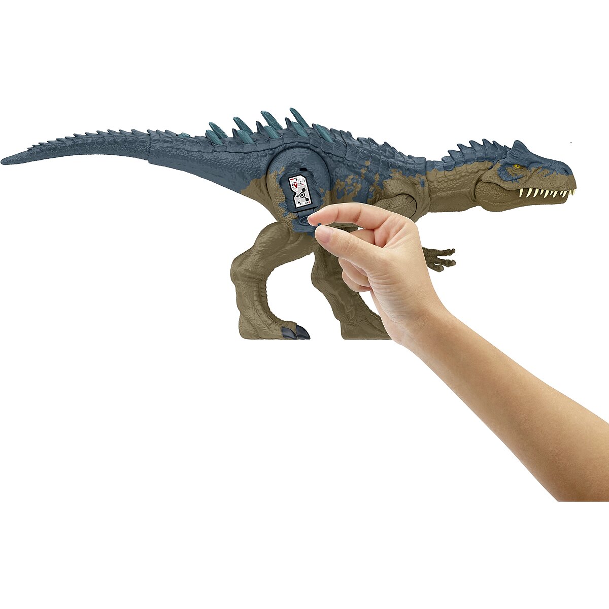 Technical_details - This huge figure simply belongs in every dinosaur collection: The Allosaurus from the Jurassic World Ruthless Rampage series is 43 centimeters long and impresses with sharp teeth and a menacing look. His body is covered in detailed textures. But that's not all: When the figure is activated using the dial, he straightens his neck, makes a downward biting movement and lets out a terrifying roar! Its spines on its back and tail become longer when the button on its tail is pressed. Further great playing options are available when the hidden track code is scanned in the Jurassic World app (smart device with Android and iOS available separately required). Item no.: 100026228 Kind of game piece EAN 0194735187935 Manufacturer no. HRX51 Jurassic World series Age recommendation from 4 years Target group of kindergarten children Material: Plastic Sound Yes Warnings Warning: Not suitable for children under 36 months! Caution: Danger of suffocation due to small parts that can be swallowed!