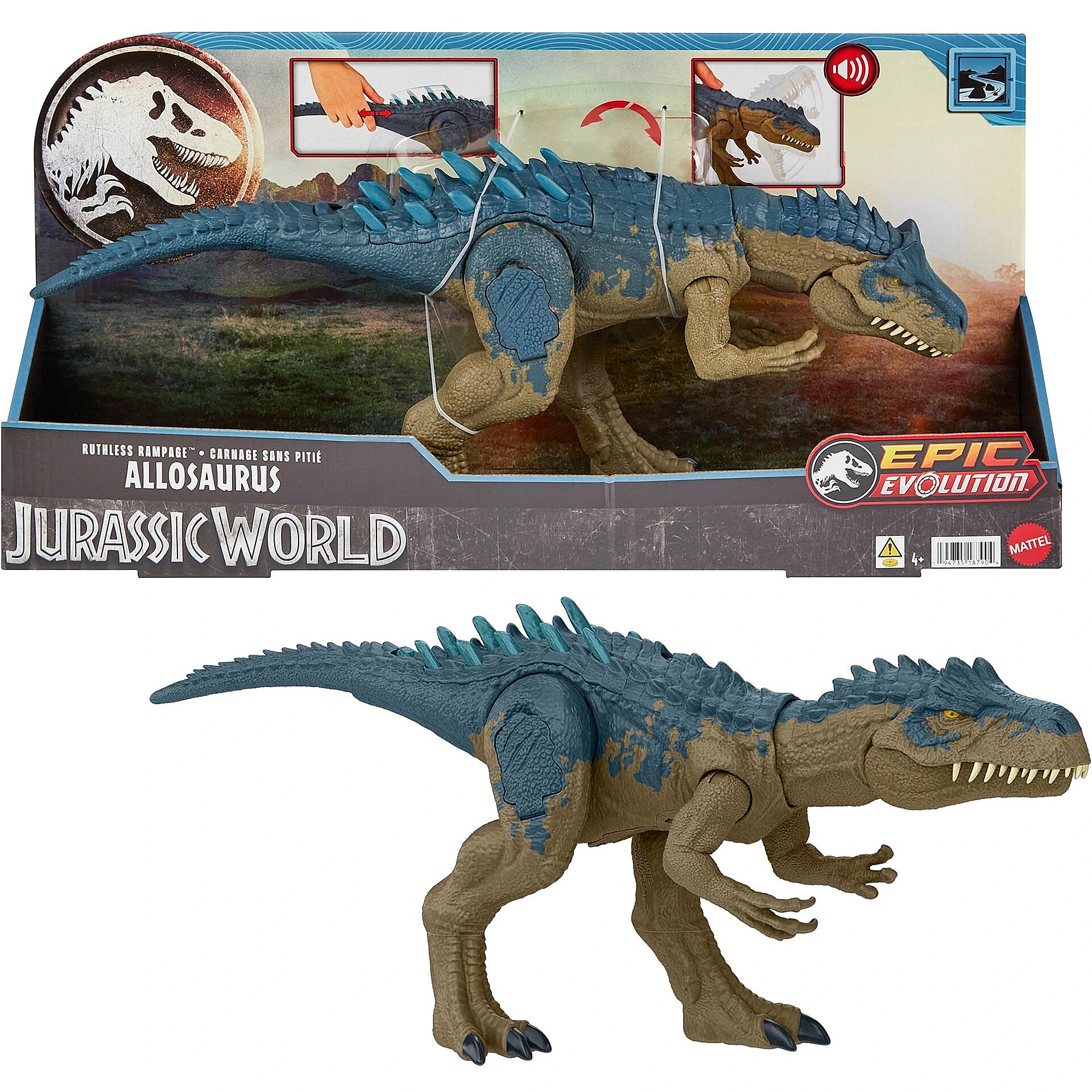 LongDesc - This Ruthless Rampagin' Allosaurus is an Epic Evolution in Jurassic World figures. The spin wheel on this dinosaur's back activates a continuous lifelike motion a rampage attack with up and down ferocious chomp and roar! A button on the tail dramatically raises the spikes on the back and tail -- this dinosaur is evolved for battle! This 17-inch posable figure has detailed texture and river habitat deco. Scan the hidden Tracking Code in the free Jurassic World Play App with a compatible smart device (Android or iOS, not included) to unlock AR experiences and fiercely fun games! For fans 4 years and older. Colours and decorations may vary.