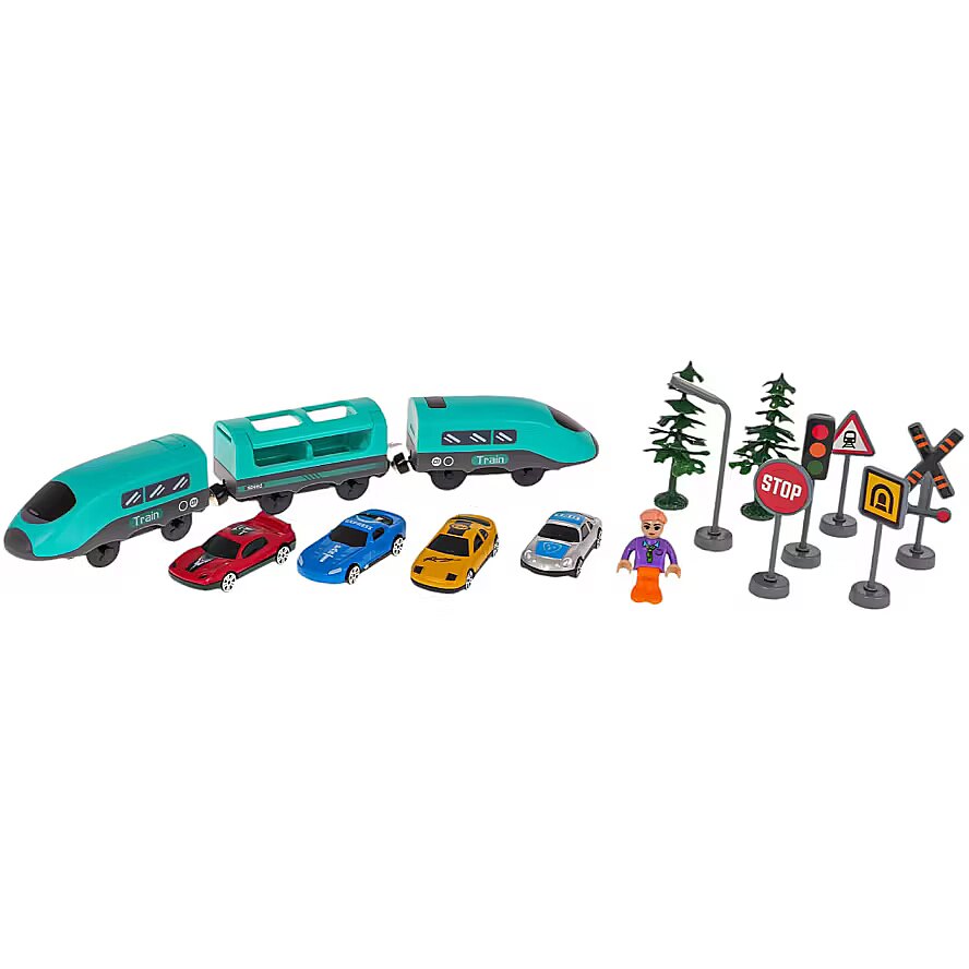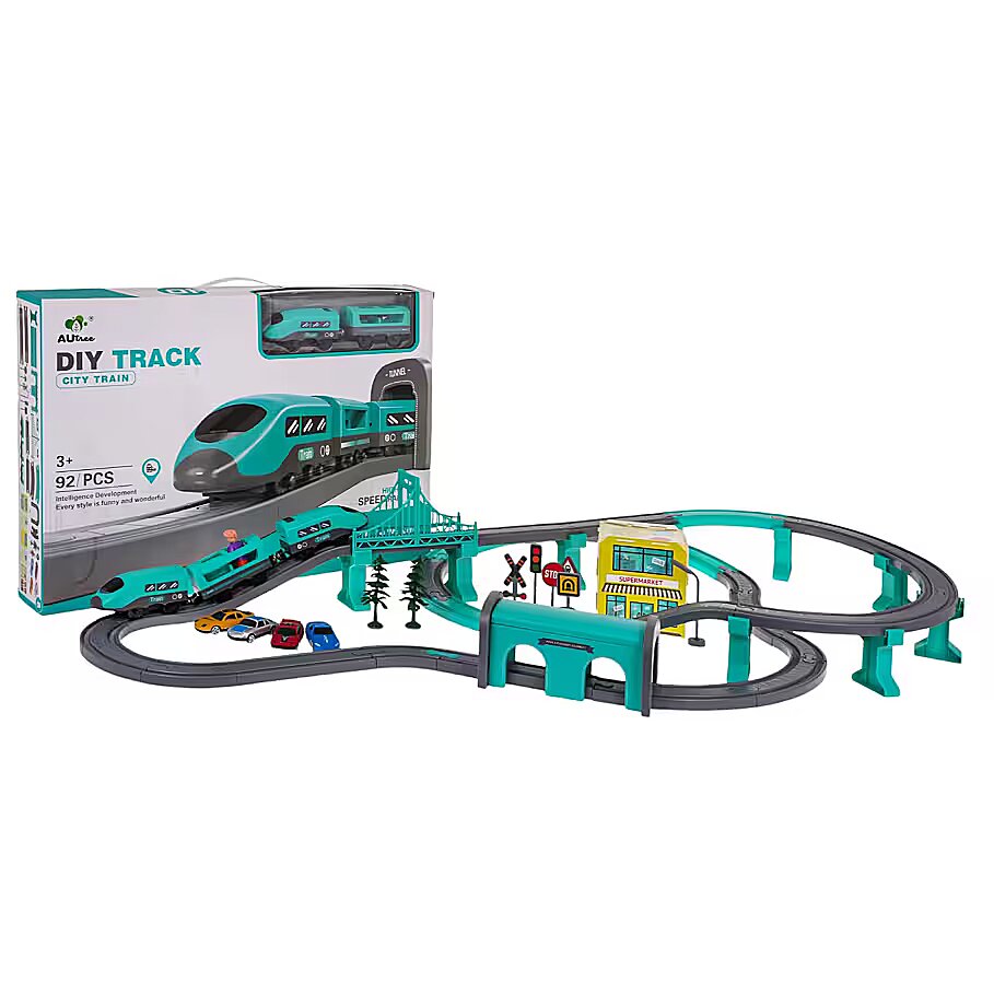 description_en - A richly equipped set of tracks with a train and accessories for children from 3 years of age. The set is made of the best quality plastic in vivid colors that attract the child's attention. The set includes 92 elements: construction parts of tracks, a train, a station, a bridge, a supermarket, road signs, as well as cars and a figure. The train is powered by 2 x AAA 1.5 V batteries (not included).