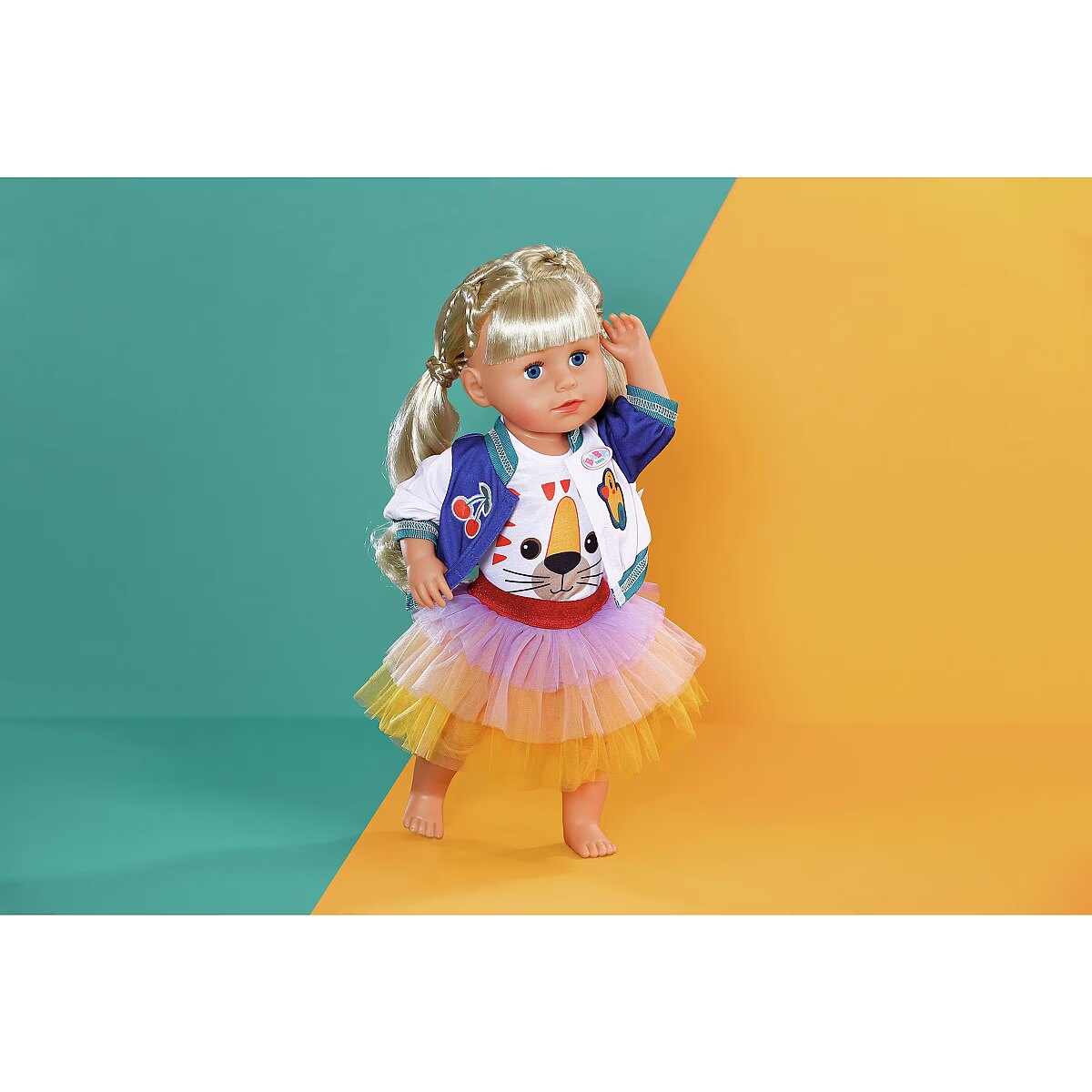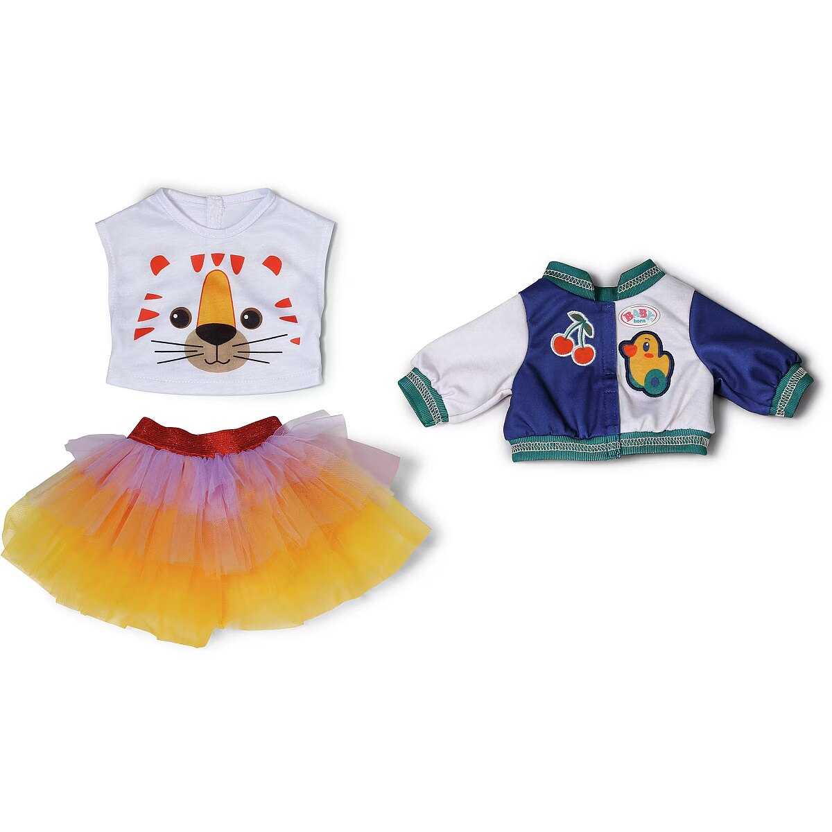 LongDesc - The tutu 3 piece outfit is super fun with a cute tiger's face on the t-shirt, a cool two-tone college jacket and a multi-coloured tutu of yellow, orange and purple. For 43cm dolls. Suitable for children aged 3+. Doll not included.