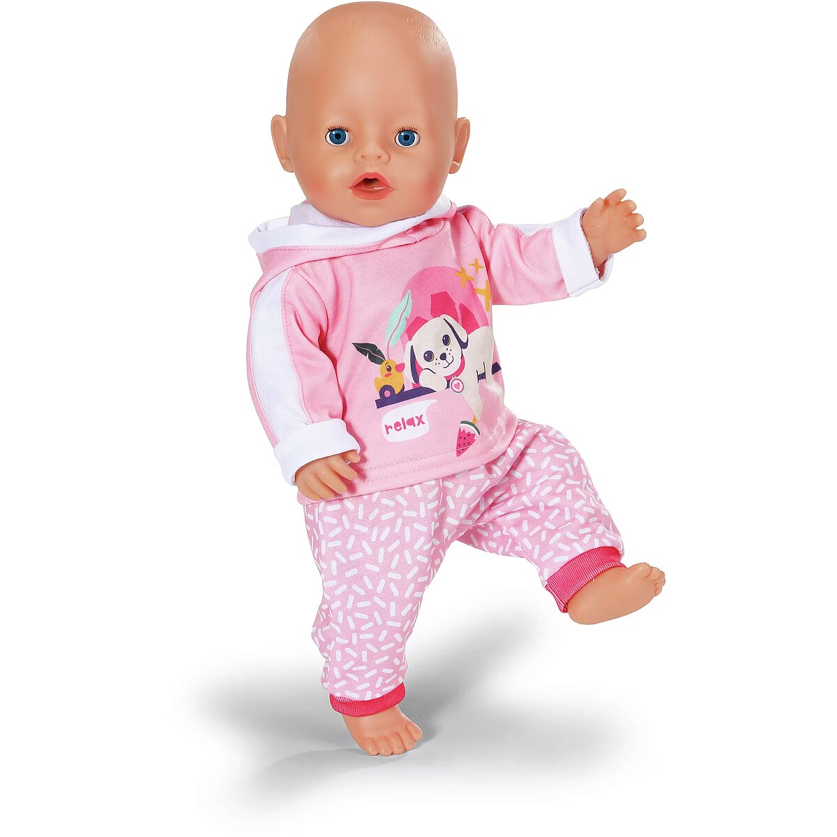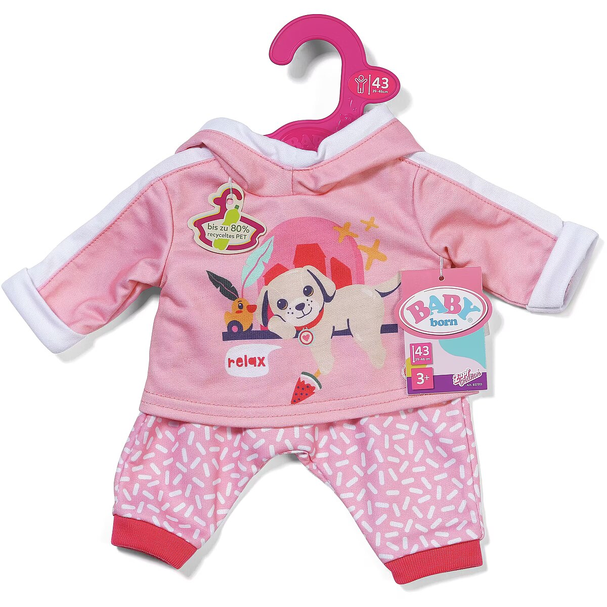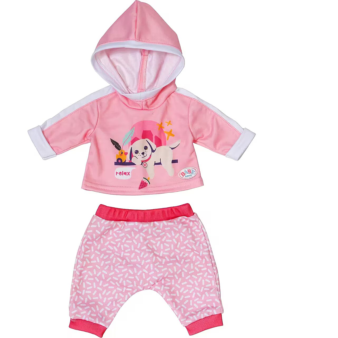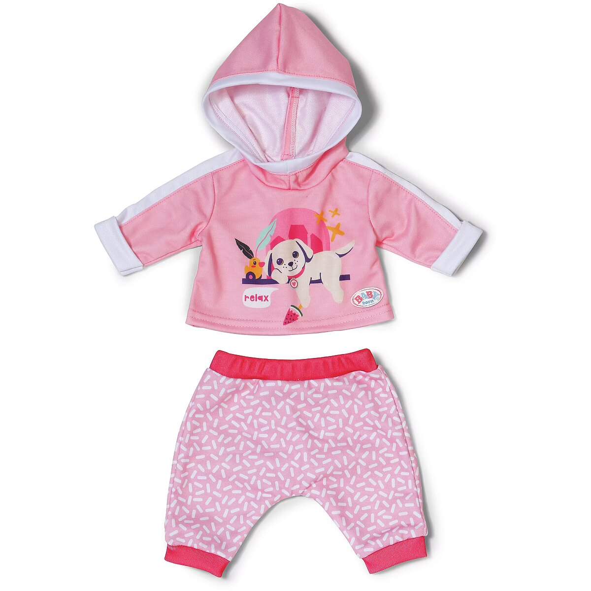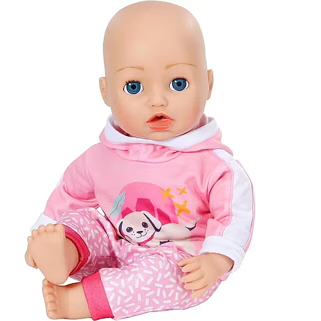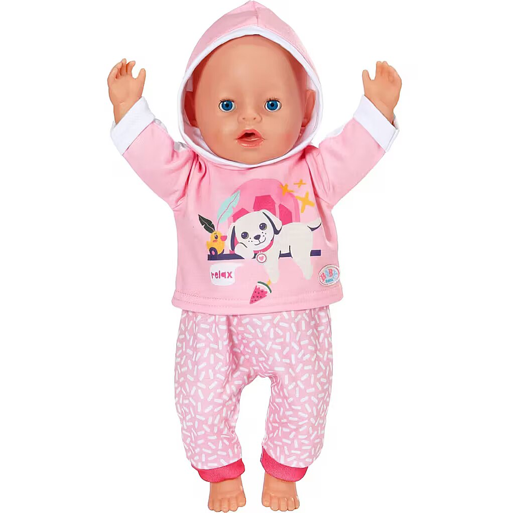 LongDesc - BABY born loves to play and this jogging suit is the perfect outfit for just that! This fun pink 2 peice set comes with patterned trousers and hoodie with a cute print of Lucky dog and Berta the duck. For 43cm dolls. Suitable for children aged 3+. Doll not included.