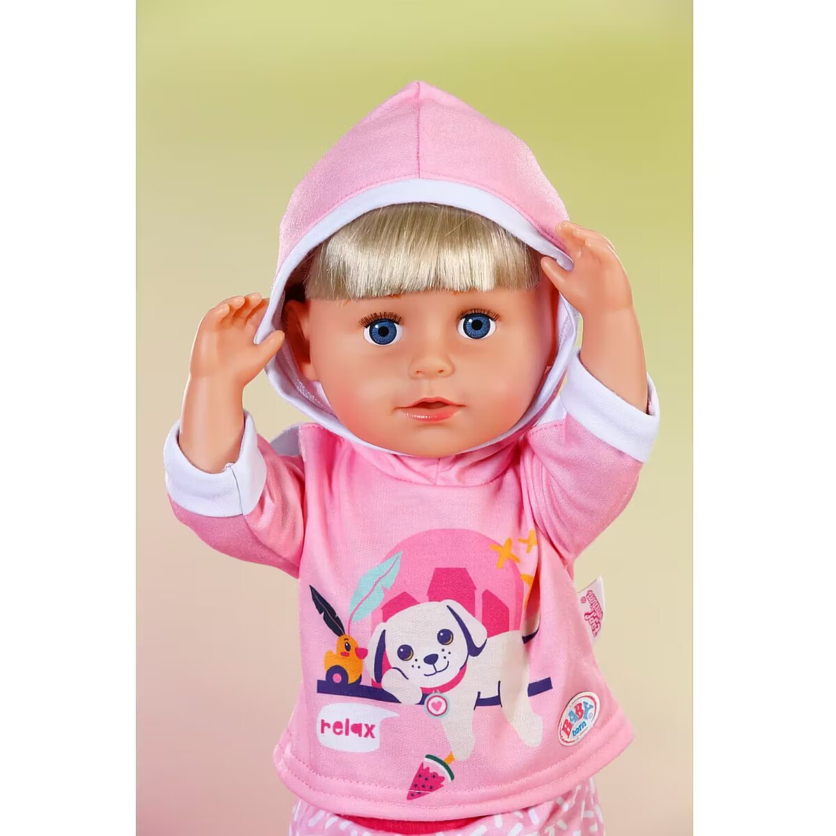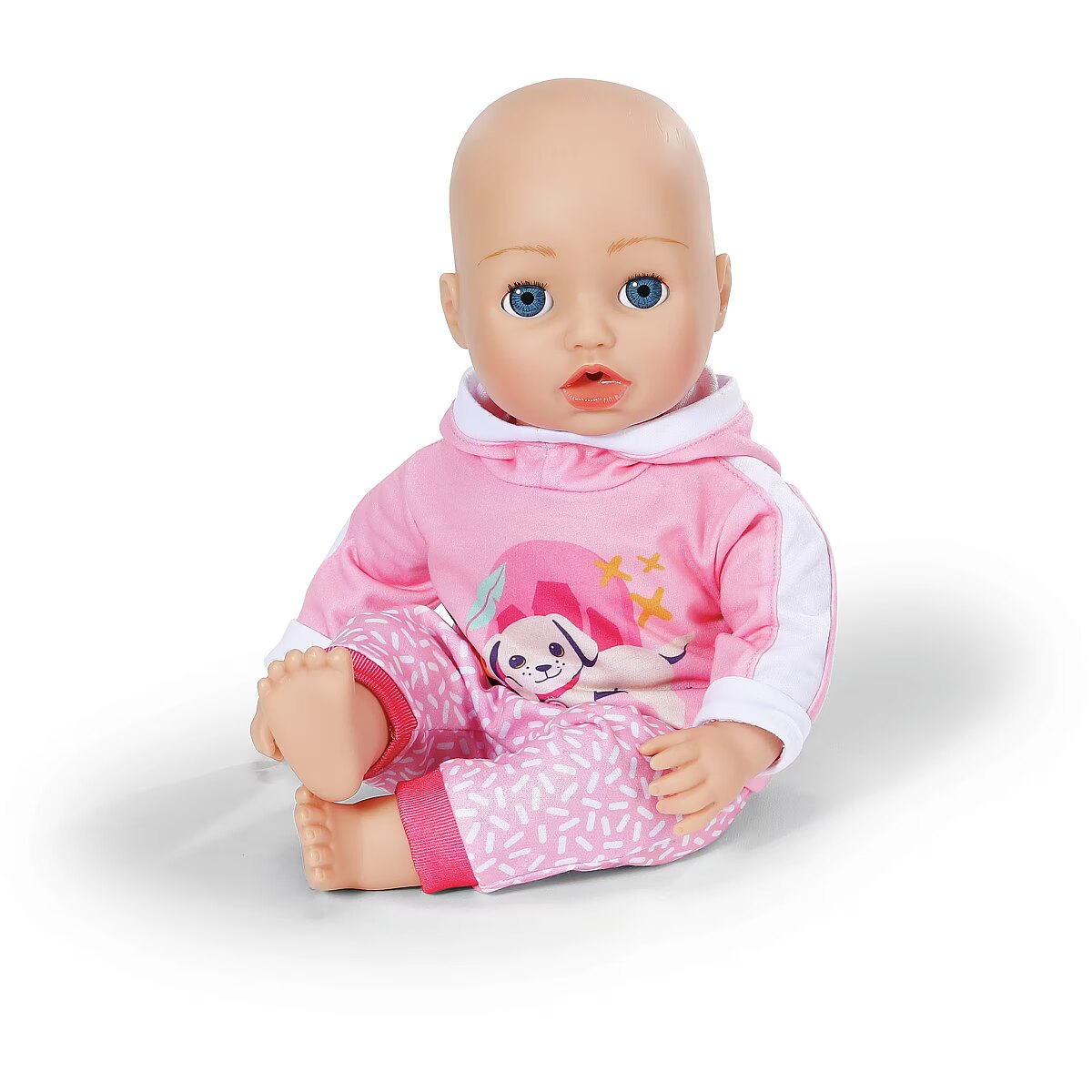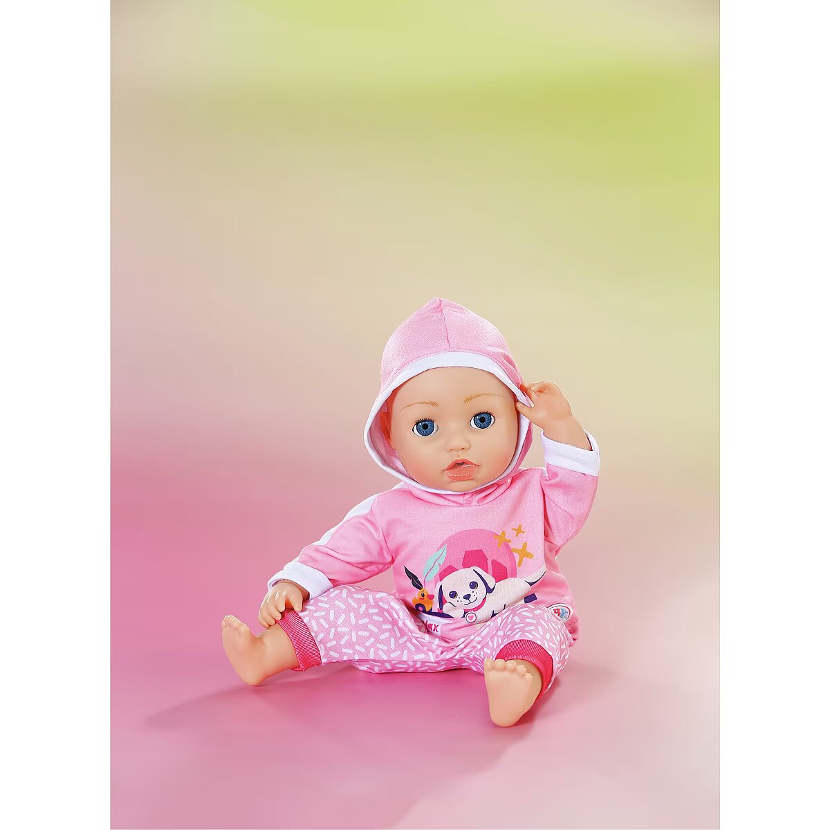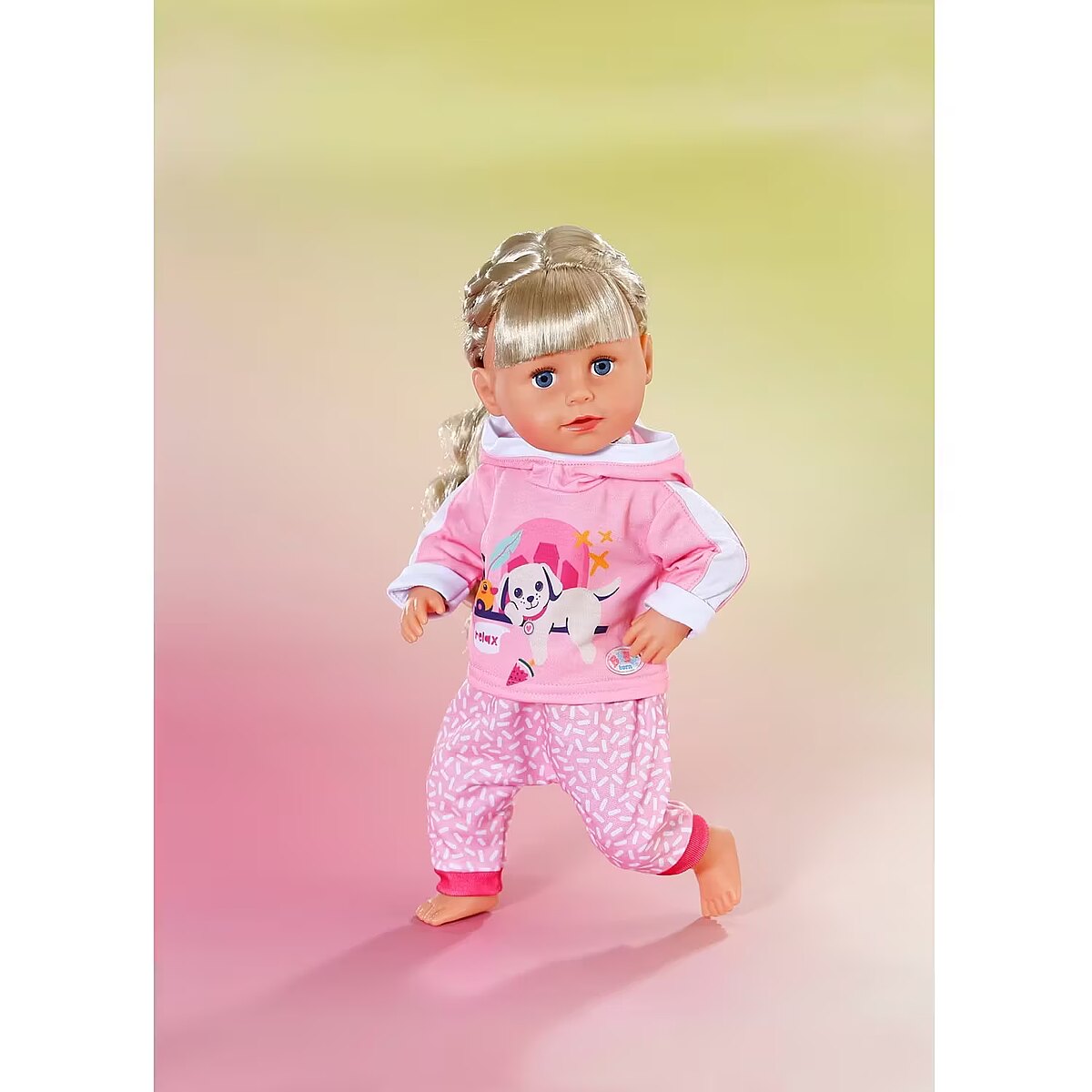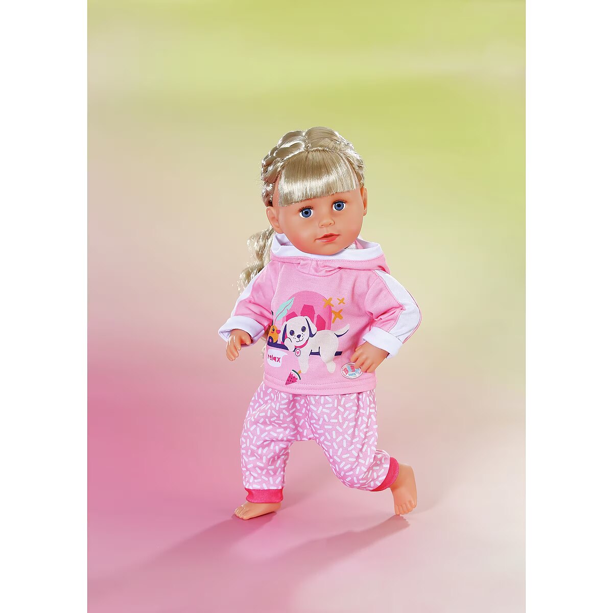 LongDesc - BABY born loves to play and this jogging suit is the perfect outfit for just that! This fun pink 2 peice set comes with patterned trousers and hoodie with a cute print of Lucky dog and Berta the duck. For 43cm dolls. Suitable for children aged 3+. Doll not included.