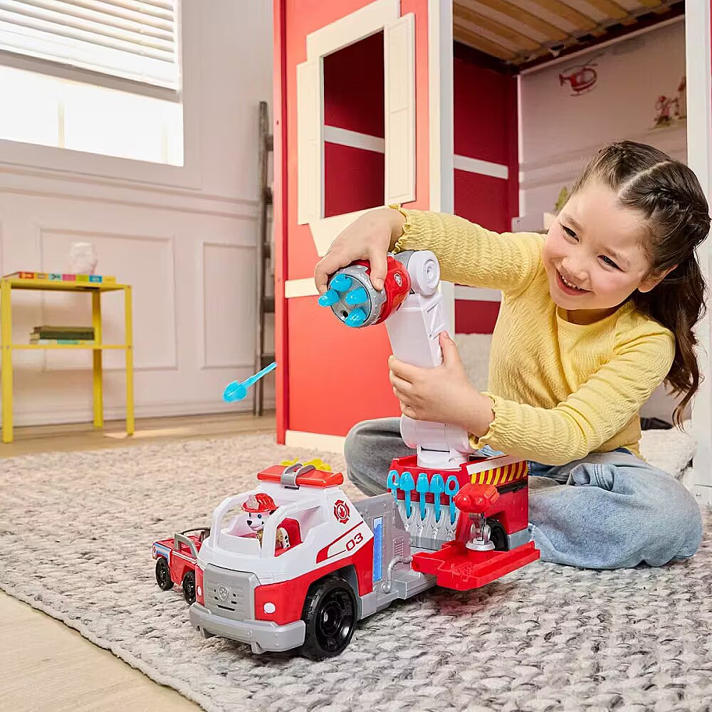 Get ready for exciting adventures with the PAW Patrol Deluxe Fire Truck! This action-packed toy is every hero's dream. It features Marshall's 20-inch fire truck with lights, sounds, and a movable rescue ladder. Kids can rotate the built-in projectile launcher to quickly fire water projectiles, then lower the ladder back down for a quick reload and quickly fire 5 more projectiles, bringing excitement to every mission. Open the truck's walls to reveal a platform, rescue arm, and dual projectile launchers. Marshall, dressed in firefighting gear, can be placed in the rear bucket so he can jump into the mini rescue vehicle at any time. Lower the rear door to launch the mini vehicle for exciting adventures! These PAW Patrol educational toys make the perfect gift for a birthday, Christmas, or any other holiday. For even more fun, combine this set with the Fire Command Center and six different Fire Rescue figures and vehicles for non-stop action (each sold separately). Relive treasured moments from previous PAW Patrol seasons, like Space Pups and the PAW Patrol movie, or create new adventures with the PAW Patrol tower, individual PAW Patrol figures, and their vehicles for supercharged adventures.