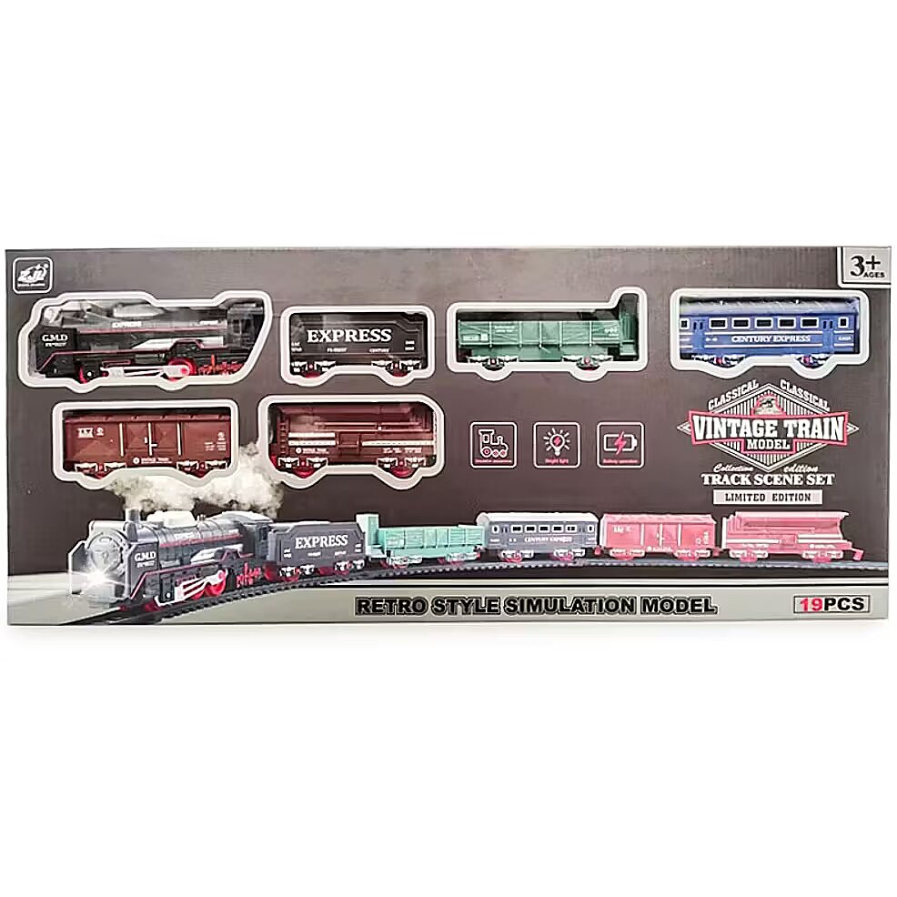 Description - Vintage Train with 19-piece track When activated, the locomotive moves forward. It moves along the tracks and the front LED lights up. Battery: 1 x AA 1.5V (locomotive) not included