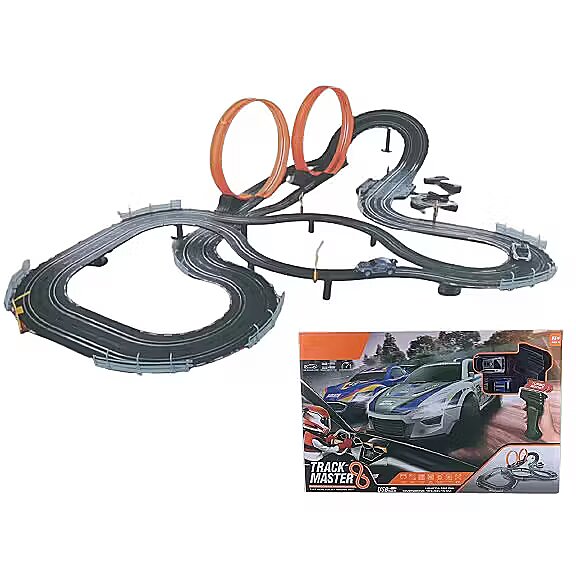 Accessories included - Extensive race track with multiple turns, straight sections, and elevations 2 x Large loops 2 x Sports-style racing cars 2 x Ergonomic speed controllers