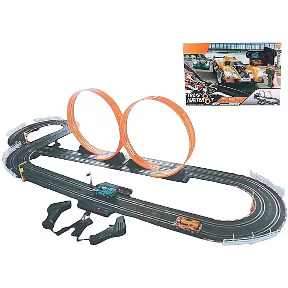 Description - Race Track with Two Loops Get ready for extreme excitement! This dynamic race track features two spectacular orange loops, sharp turns, and adrenaline-pumping straight sections. Its the perfect set for children who love speed, competition, and impressive car stunts. Key product features: Modern race track with fast turns and double loop Includes 2 sports cars - ready for racing 2 wired controllers for speed control Stable construction ensuring smooth loop transitions Decorative barriers and track elements for added realism Suitable for children around 8 years and older