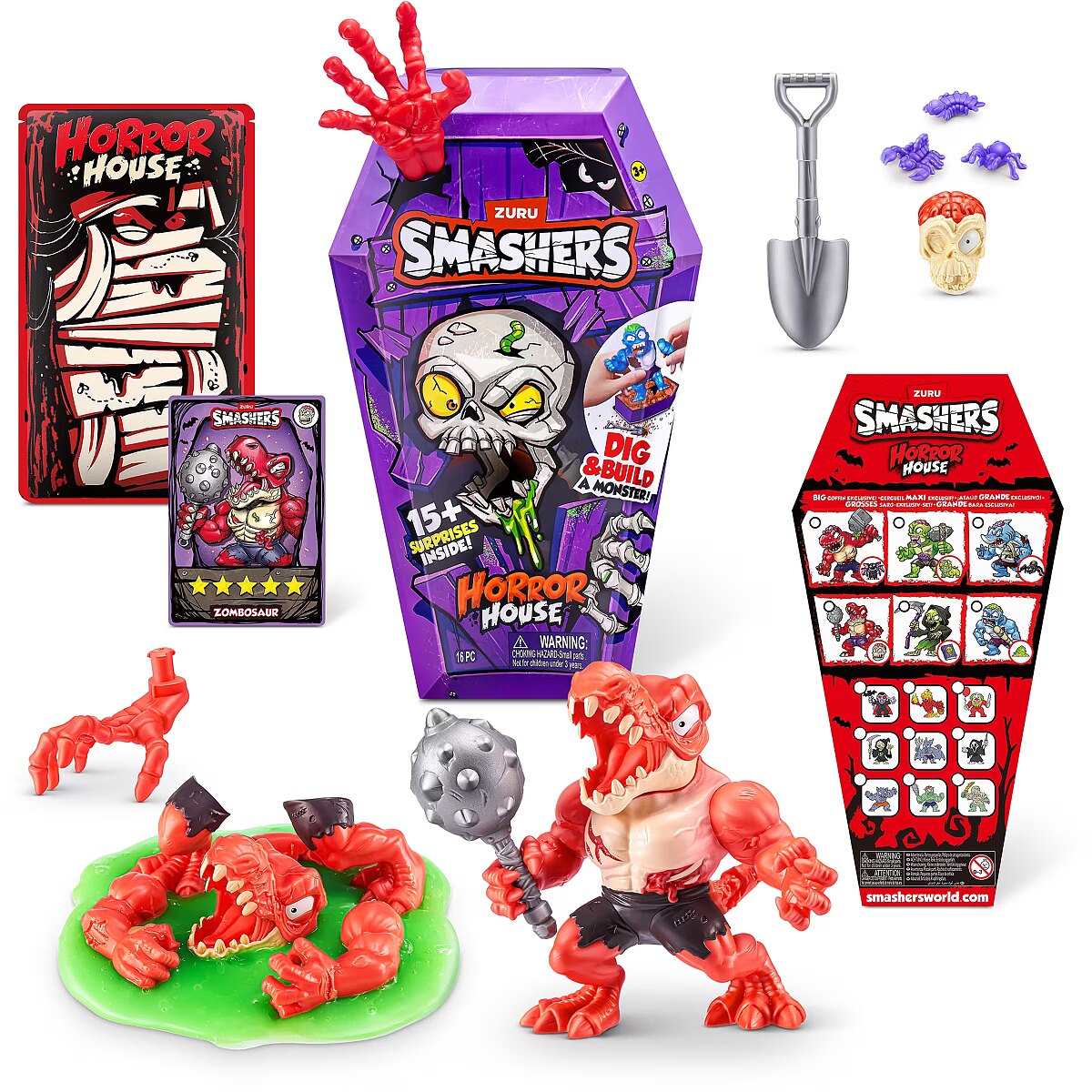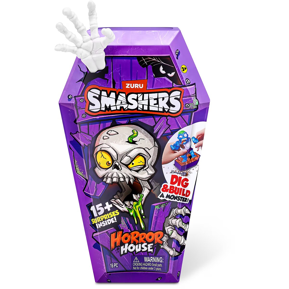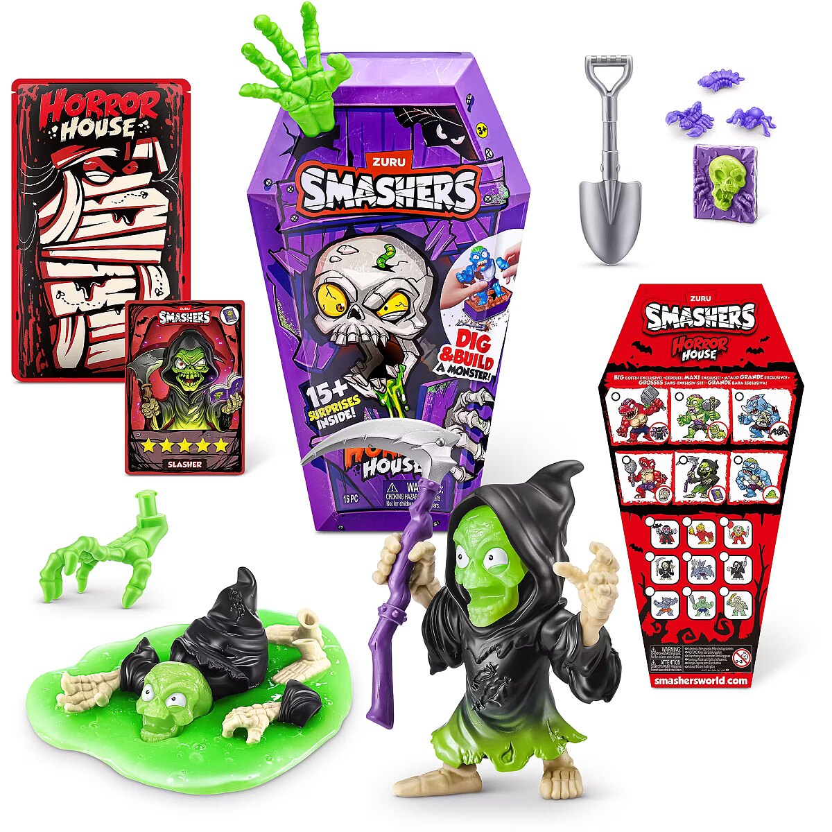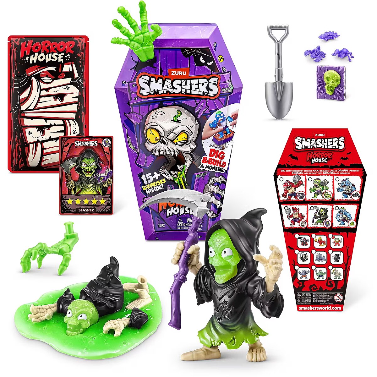 LongDesc - Smashers Horror House Series 1 ZURUSmashers Horror house takes you on a spooky quest. Smash, dig, and dissect, to bring your monster to life. With 15+ surprises inside, are you brave enough to open up the coffin and unearth a monster! Build and battle your monsters as you collect them all!